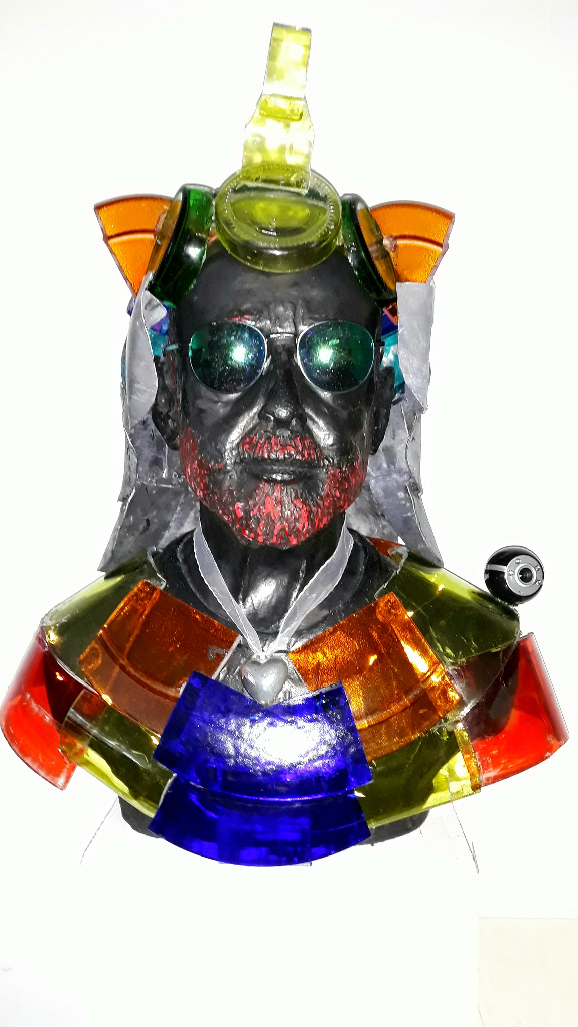 Een zelfportret gemaakt in klei en afgegoten in gips. Niet tevreden over het resultaat. Daarom omgewerkt naar Zelfportret? De selfie in witte gips kon al voorzien worden van een vraagteken vanwege de beperkte gelijkenis. De nieuwe versie levert ook een vraagteken op, alleen om heel andere redenen.