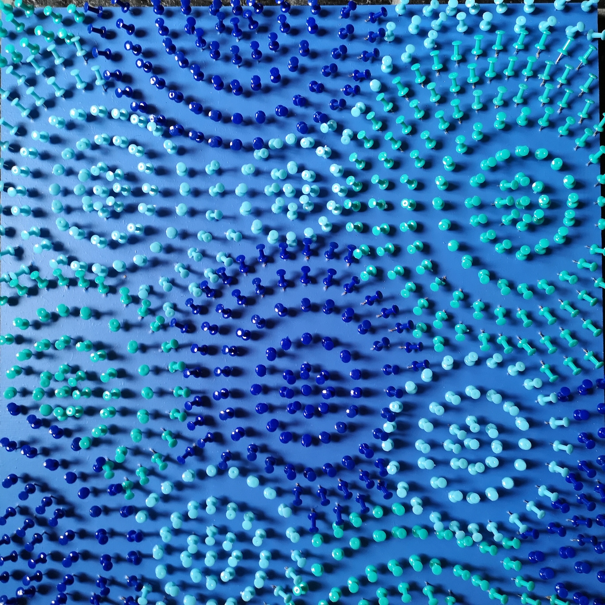 Dit werk behoort tot de 'Pushpin _serie', een reeks van optische werken. Door het gebruik van pushpins wordt een prachtig optisch effect bereikt door de weerspiegeling van het materiaal en het effect van licht en schaduw. De nieuwe reeks pushpins zijn werken met als inspiratie dahlia's.