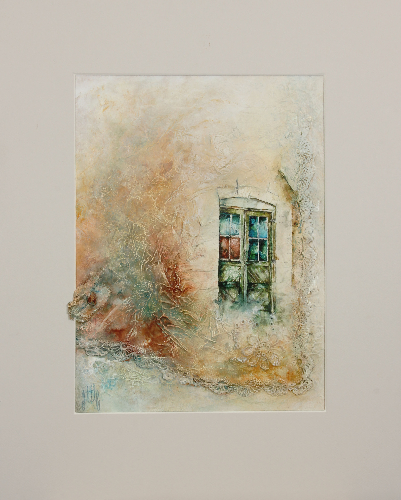 Gedeelte deur voormalige stal. Mixed media textiel acryl inkt pigmenten op papier. Ingelijst, lichtgekleurd dubbel passe partout (niet op deze foto)