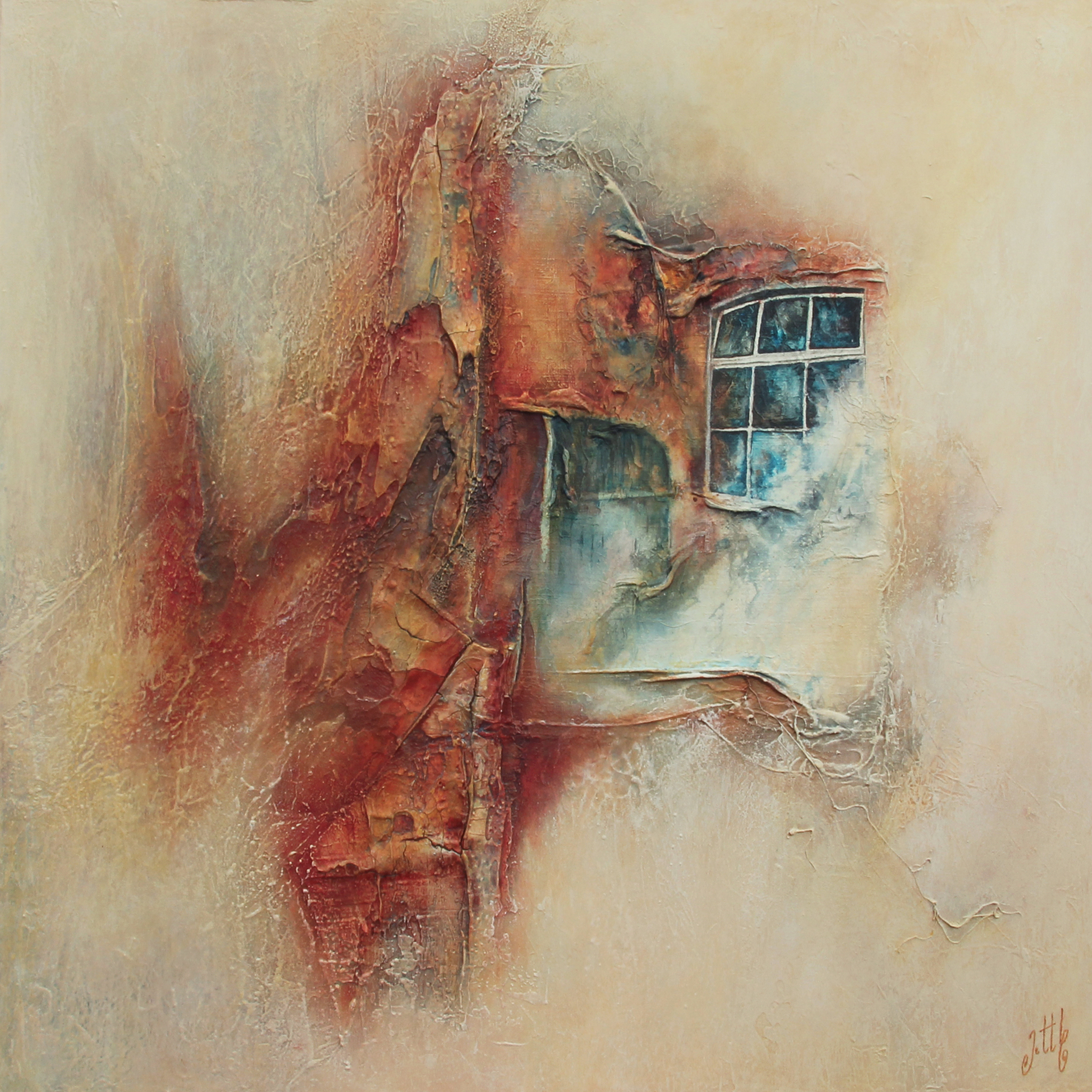 In de gebouwen op het erf van mijn voorvaderen liggen de verhalen besloten. Erf met een rijke historie. Mixed media marmermeel linnen acryl inkt