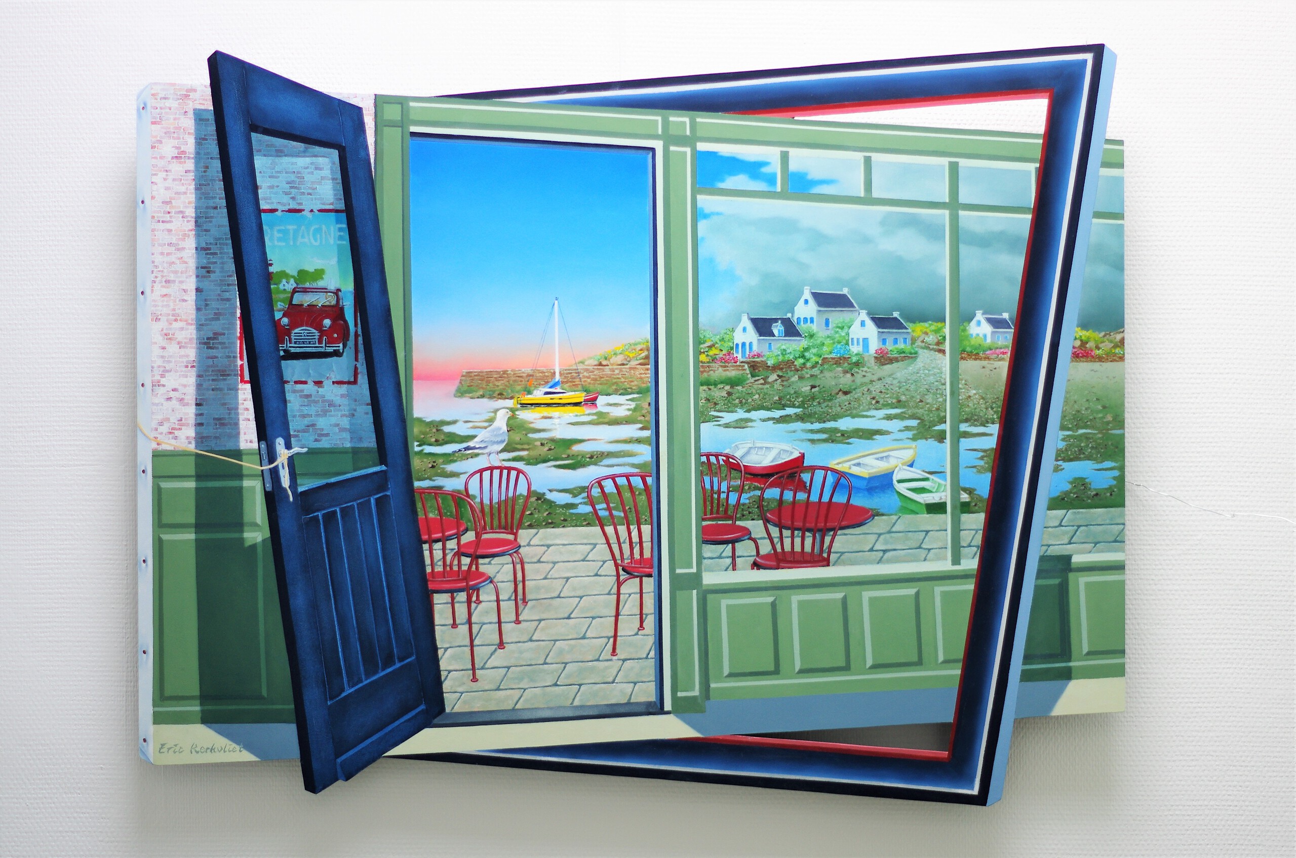 Ruimtelijk Realistisch Olieverfschilderij op Paneel 80 x110 cm. “ Terrasse du Port” Expositie leden “ Leidsche Mondialen” in de Stadstimmerwerf, Kort Galgewater 21, Leiden. Meer info: e.kerkvliet@ziggo.nl