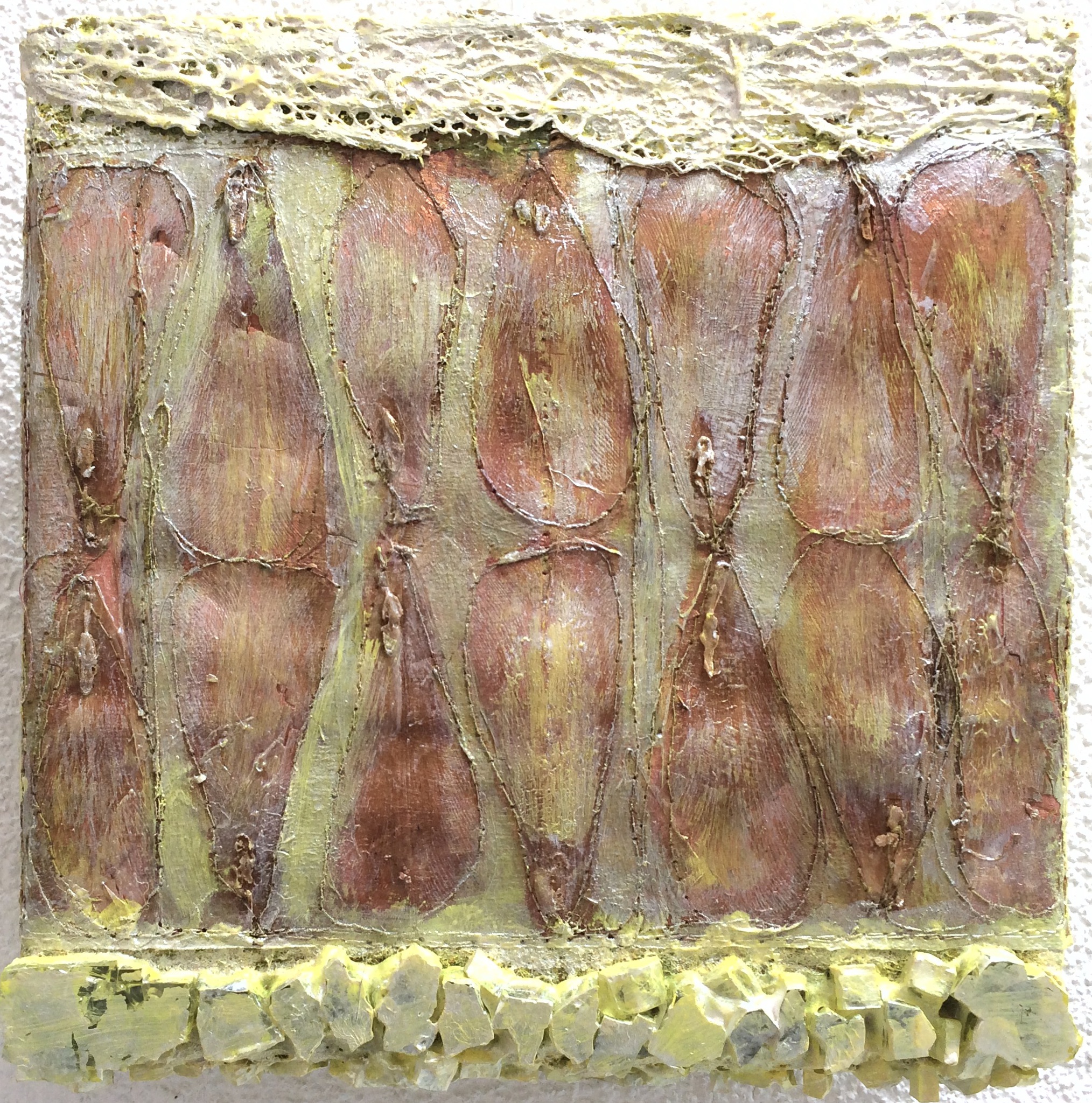 Natuurassemblage van blaadjes van tulpen en cactus nerven op papier. Gestikt, metallic verf, glas. Op 4cm diep paneel