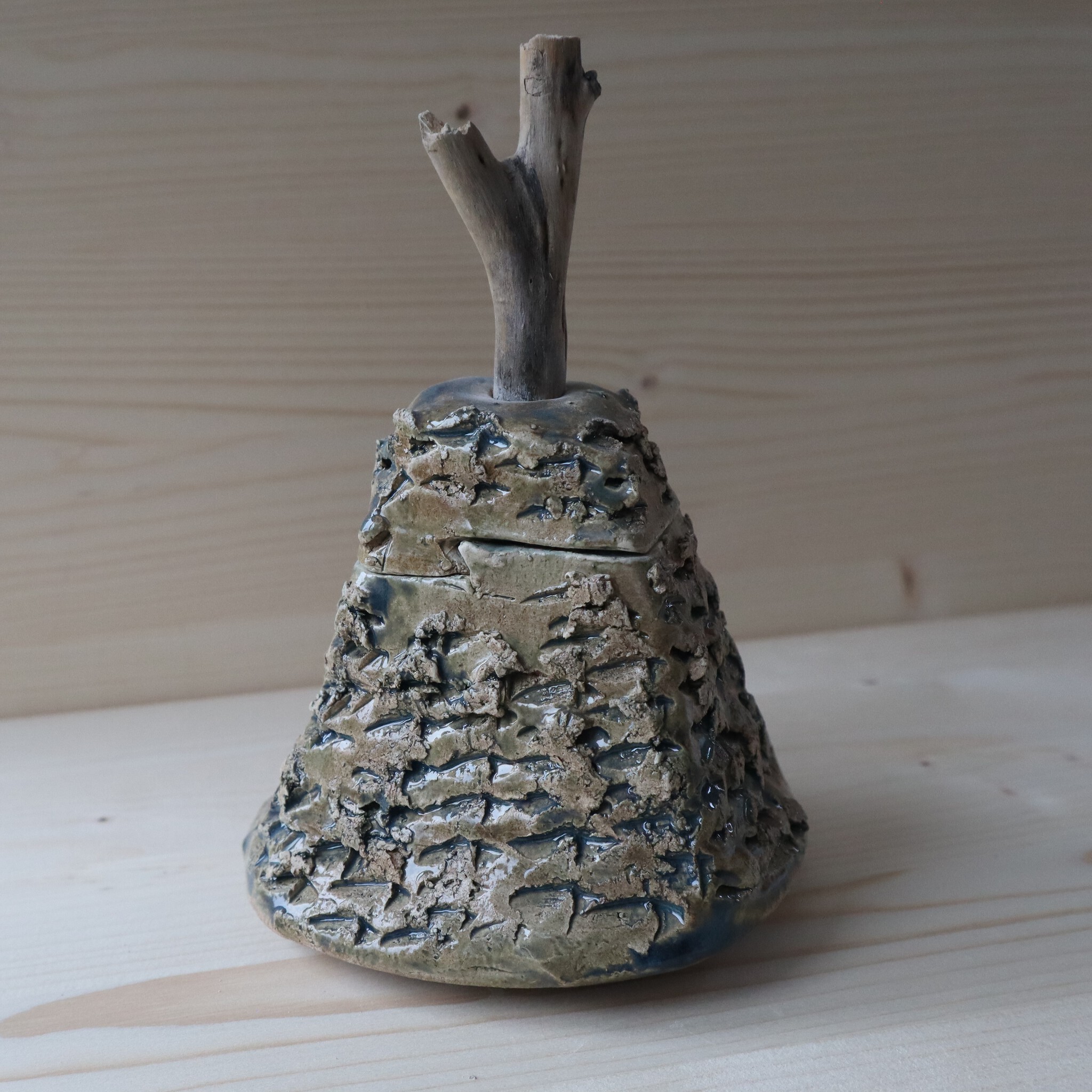 Deze doos is gemaakt van witte chamotte klei met glansglazuur en een tak als knop. Gewicht 612 gram.