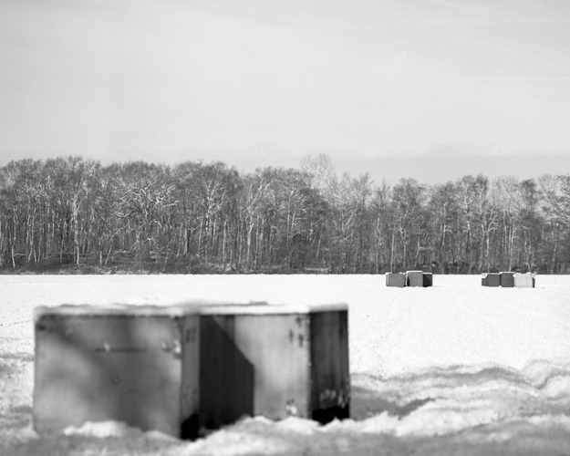 Kisten voor bloembollen op het land Oplage: 3 stuks Afdruk op dibond achter acryl glas - z/w foto. Achter de foto zit een aluminium u-profiel om het werk op te hangen.