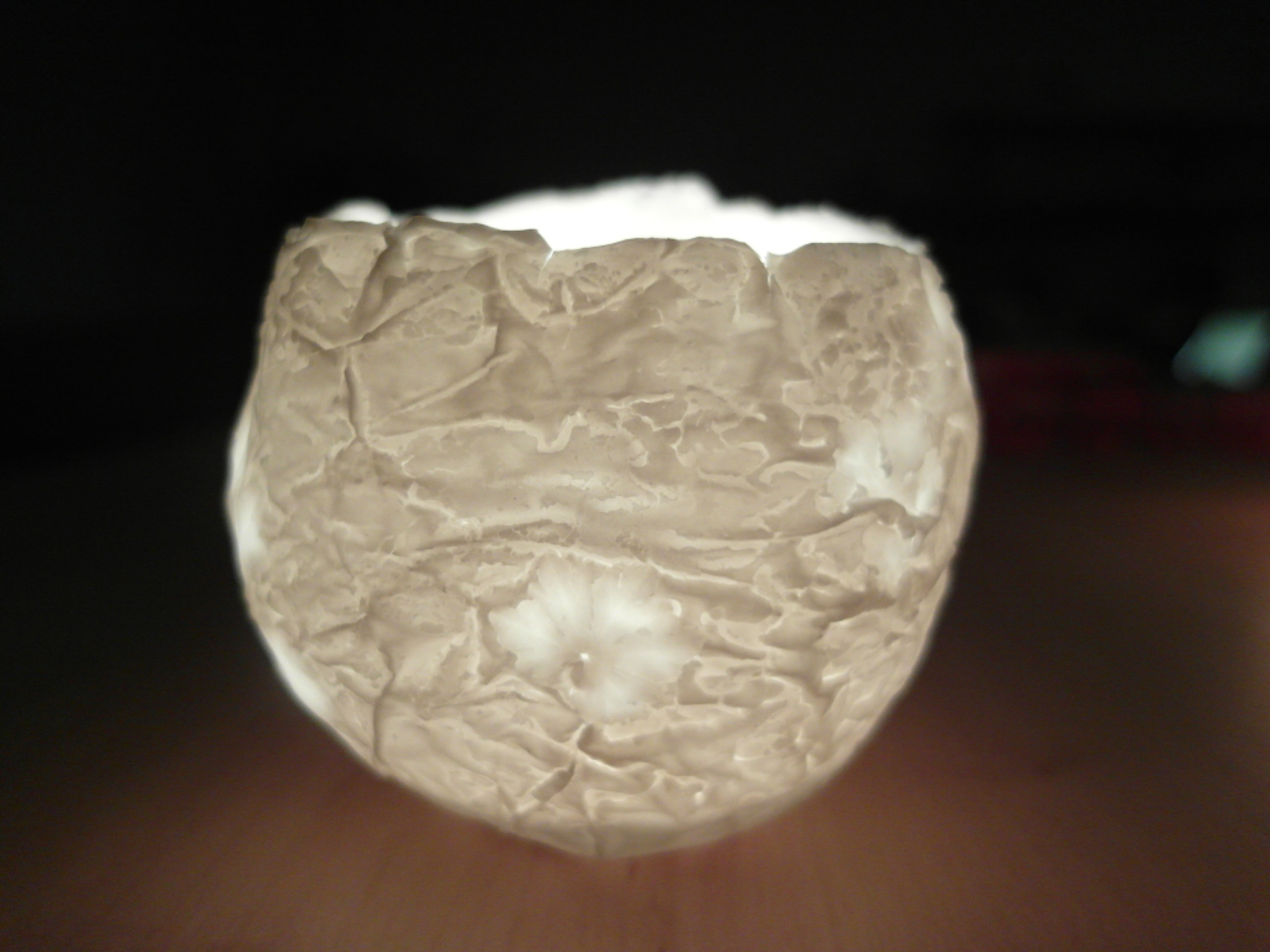Theelichthouder die ook zonder kaars licht doorlaat en daardoor altijd boeiend is. Porselein, dus sterk. Met afdruk van bloemen.