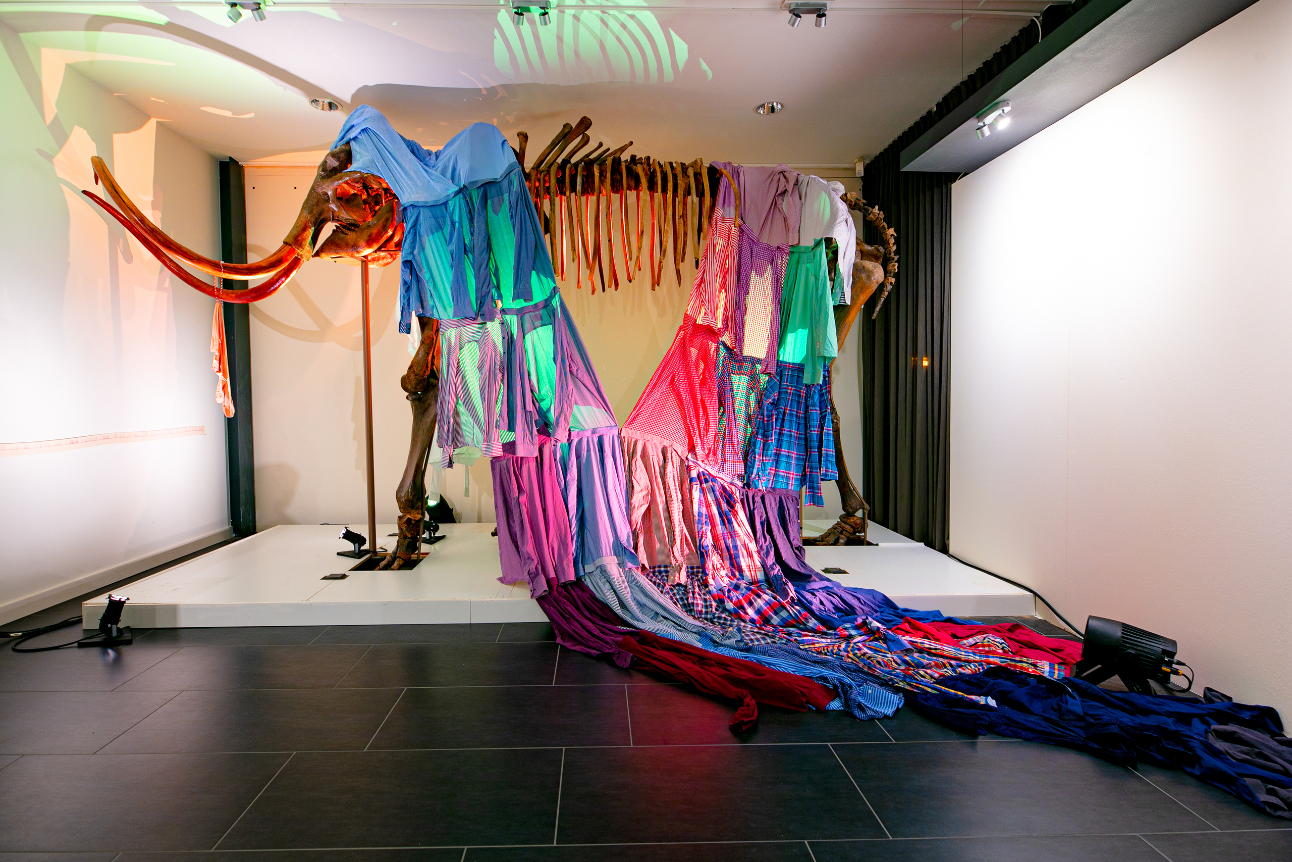 Installatie van mammoetskelet van 2,6 m hoog en 5 m breed met 42 vintage overhemden; aan de slagtand hangt een bewerkte oude nylonkous aan een rozenkrans. Op de muur oud band, geborduurd met silhouetten.