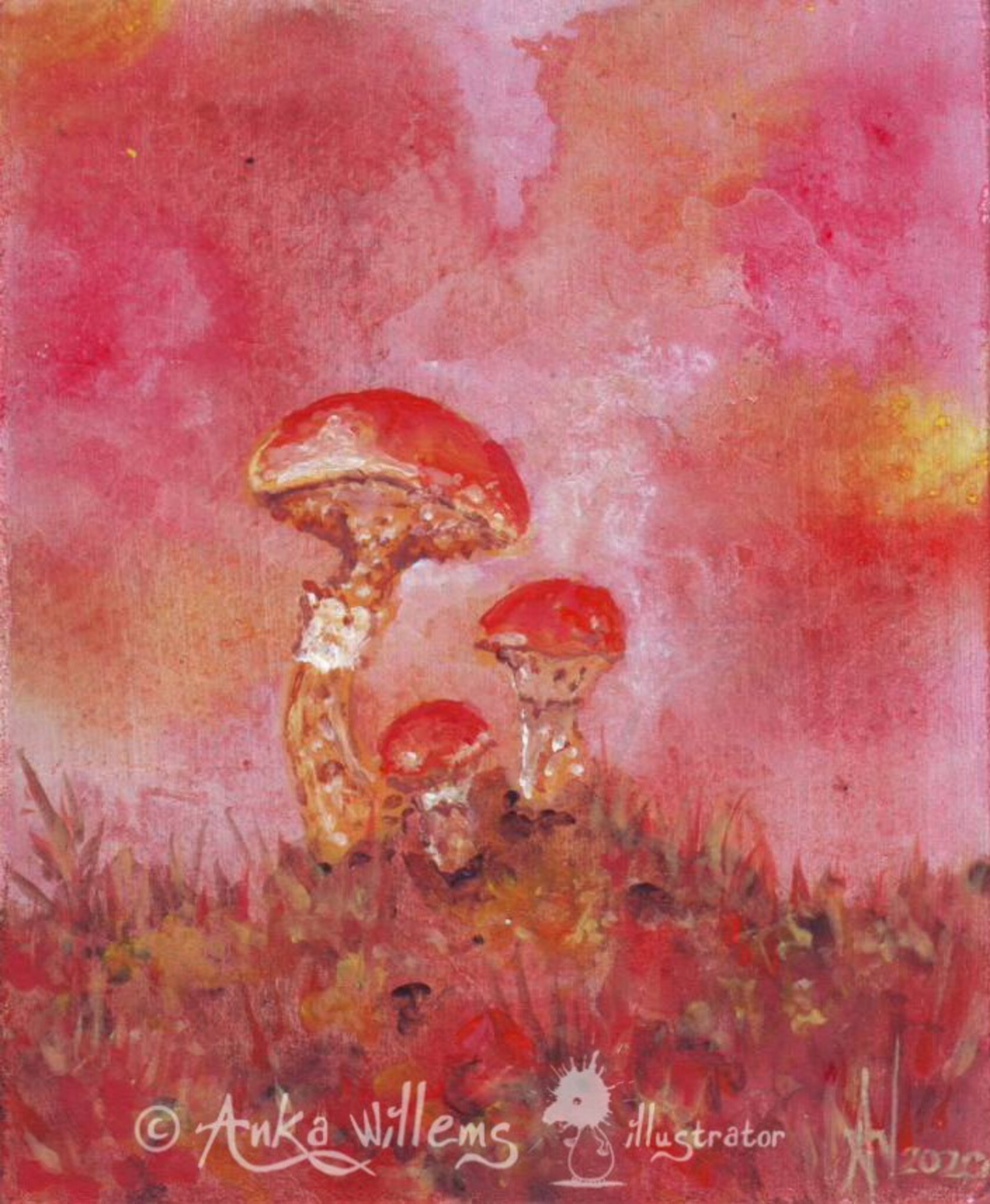 Oranje paddestoelen geschilderd op een kleurrijke achtergrond.