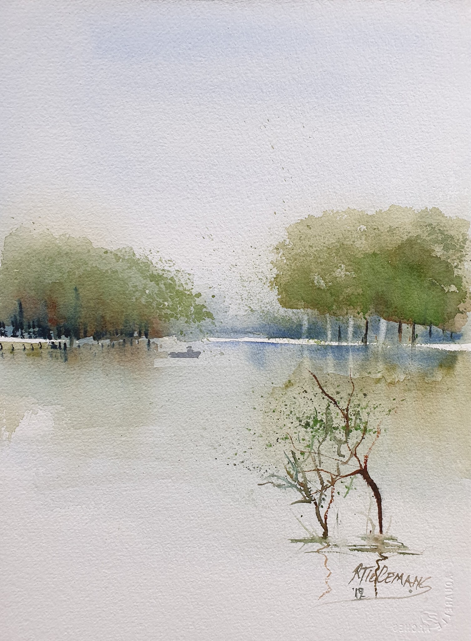 Landschap Blauw Groen Water Aquarel Natuur Bootje