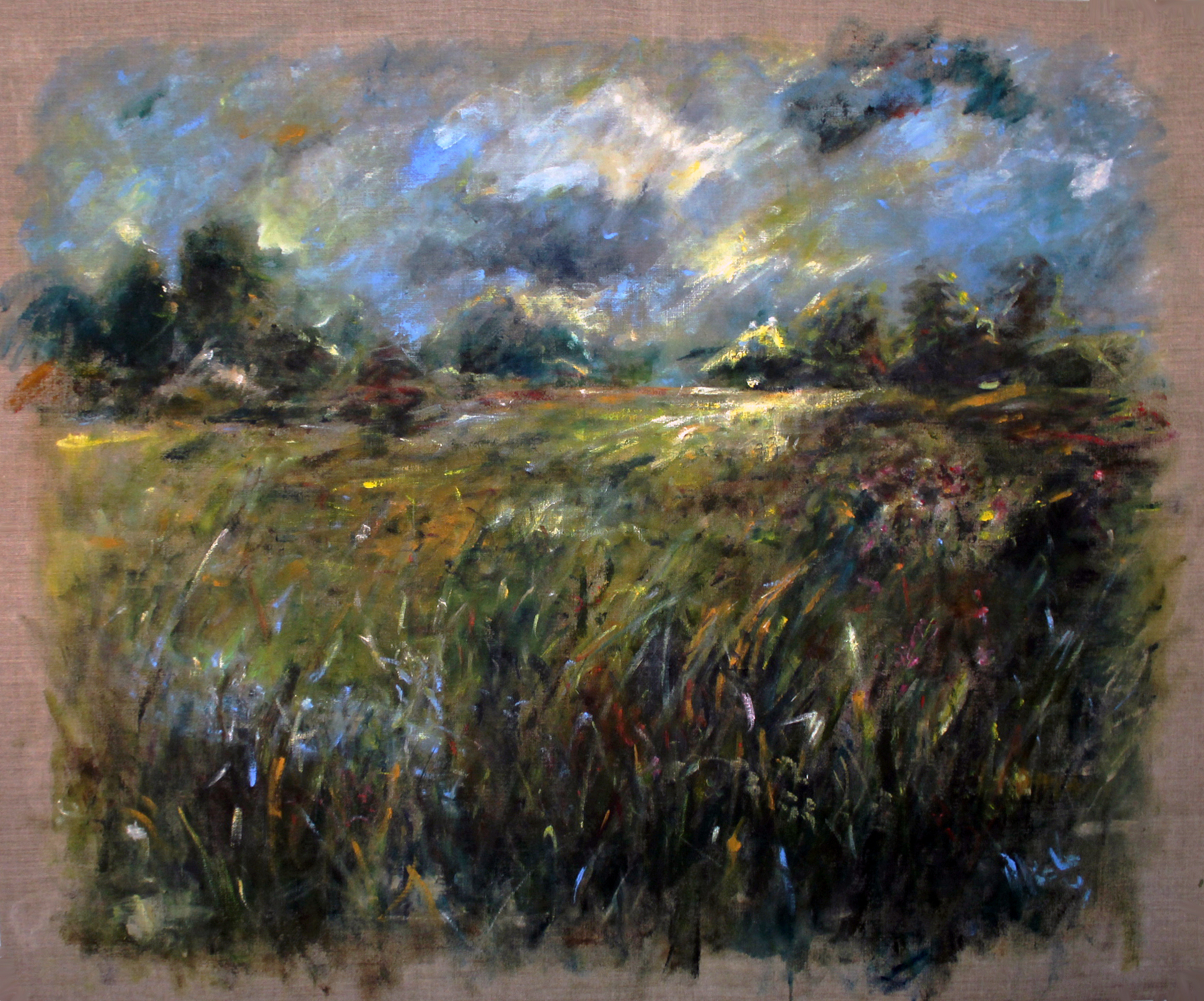 Landschap geborsteld op jute, de ondergrond speelt mee in het doek