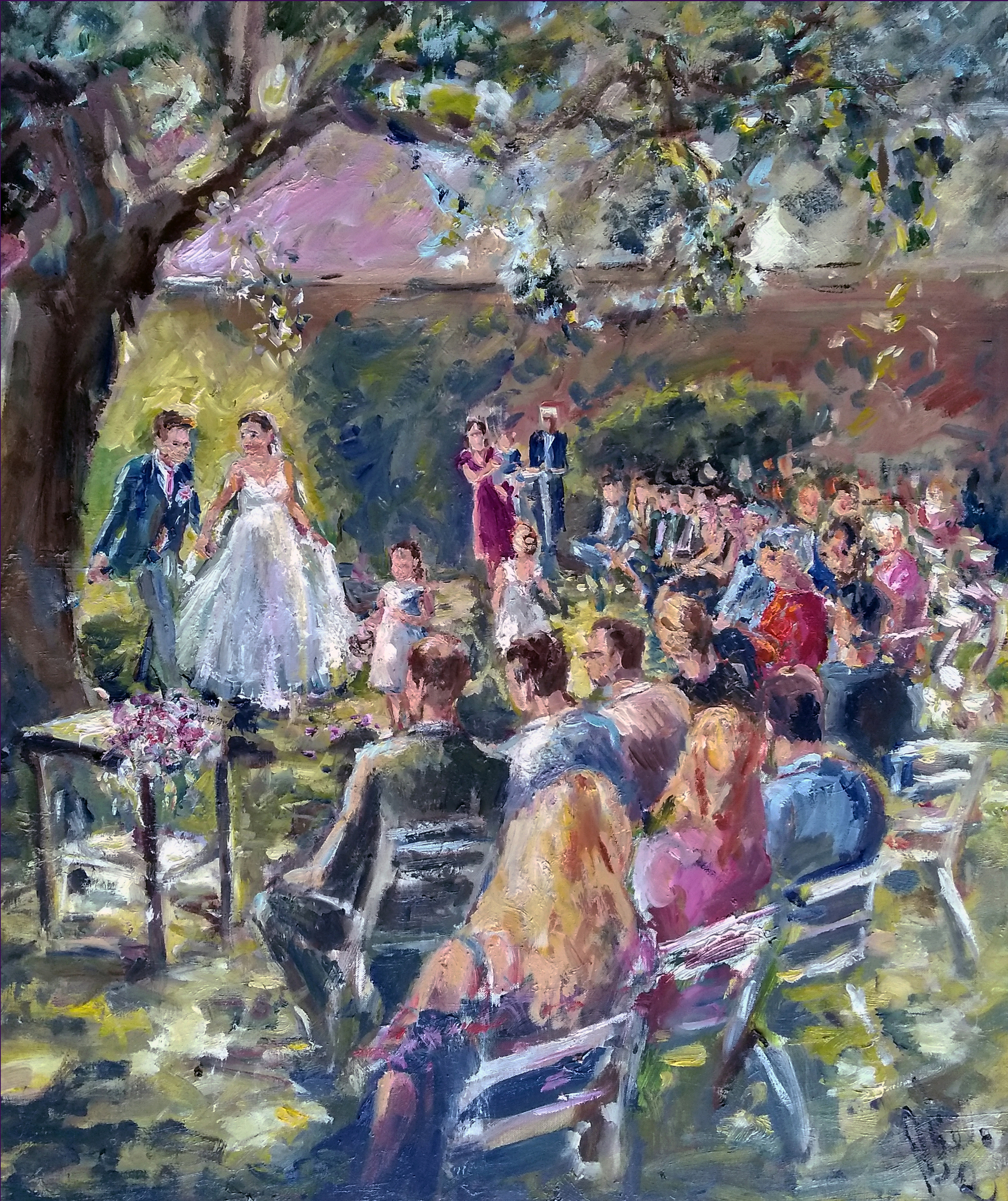 Mieke van Zundert maakt live een schilderij van uw bruiloft. Met haar ezel komt ze midden op uw feest staan. U kunt samen met haar het beste moment kiezen: de receptie, het diner, het tuinfeest of het zaalfeest. Zelfs de trouwceremonie kan in overleg live schilderend vastgelegd worden. Zo’n schilderij in olieverf op linnen, de beste materialen dus, is een prachtige stijlvolle herinnering van de trouwdag. Kijk ook www.schildervanliefde.nl