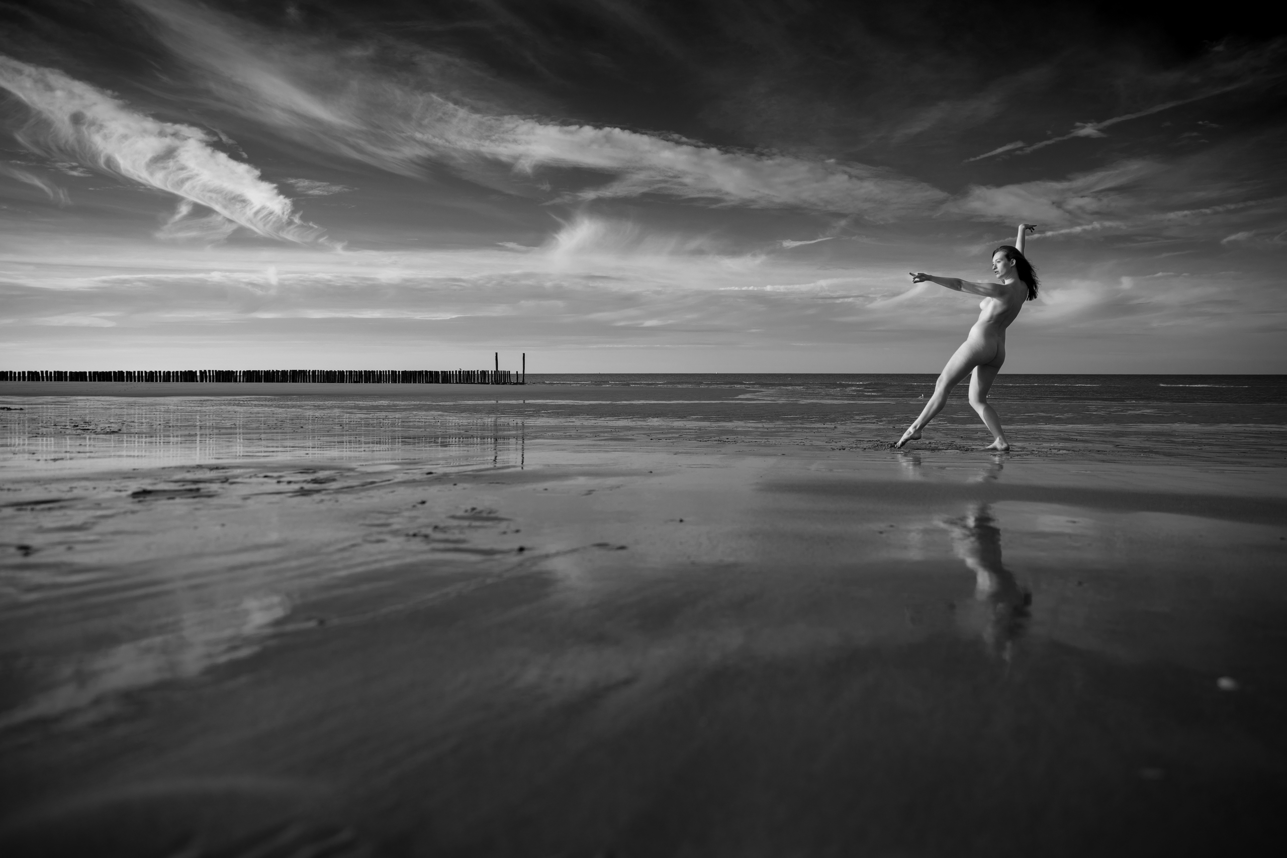 BnW opname van model Sophie op het strand van Groede - Zeeuws Vlaanderen - oktober 2019 - fine art paper op dibond