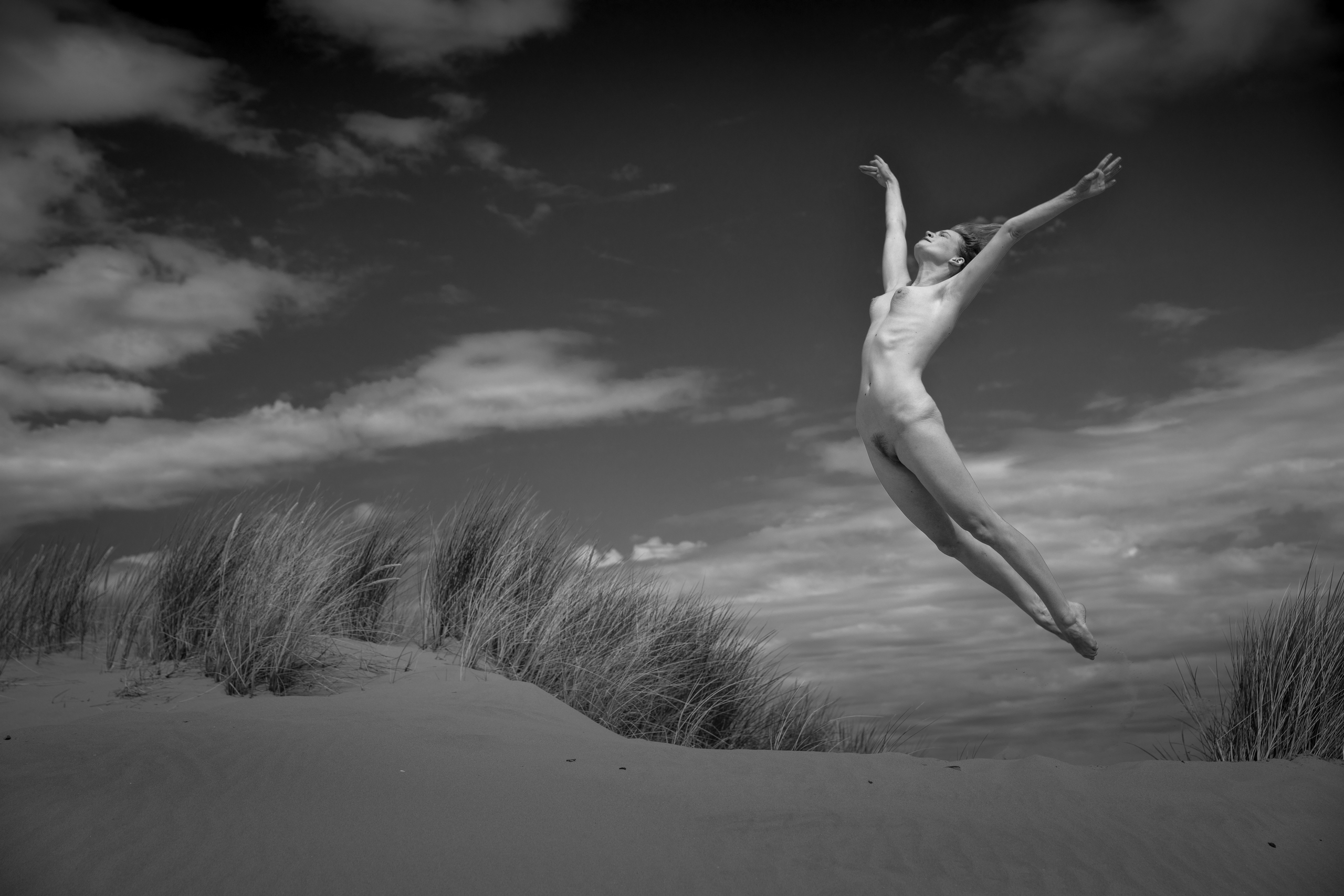BnW opname van een zweefsprong door model Dovile op het strand van Ouddorp - september 2019 - fine art paper op dibond
