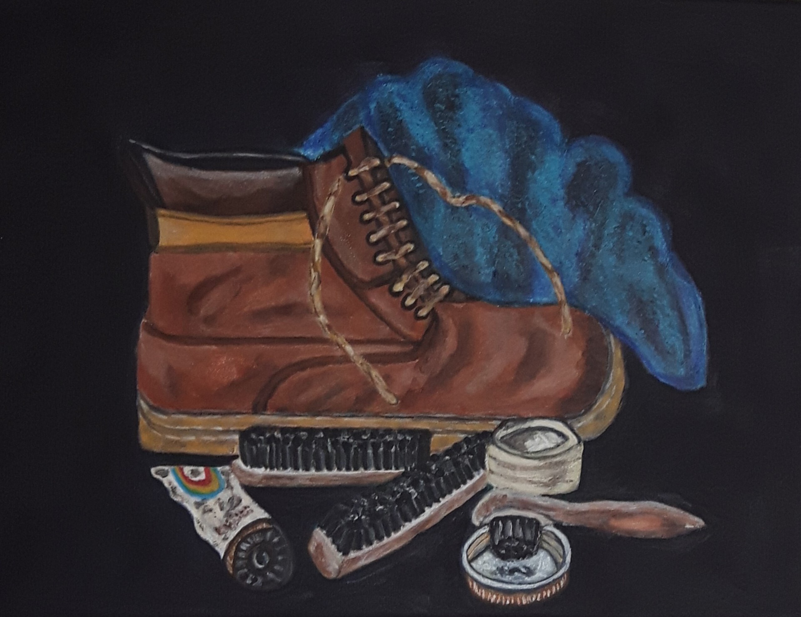 schoen met poetsmiddelen, doek, geschilderd met acrylverf Expositie 2019 De Meent te Nuland