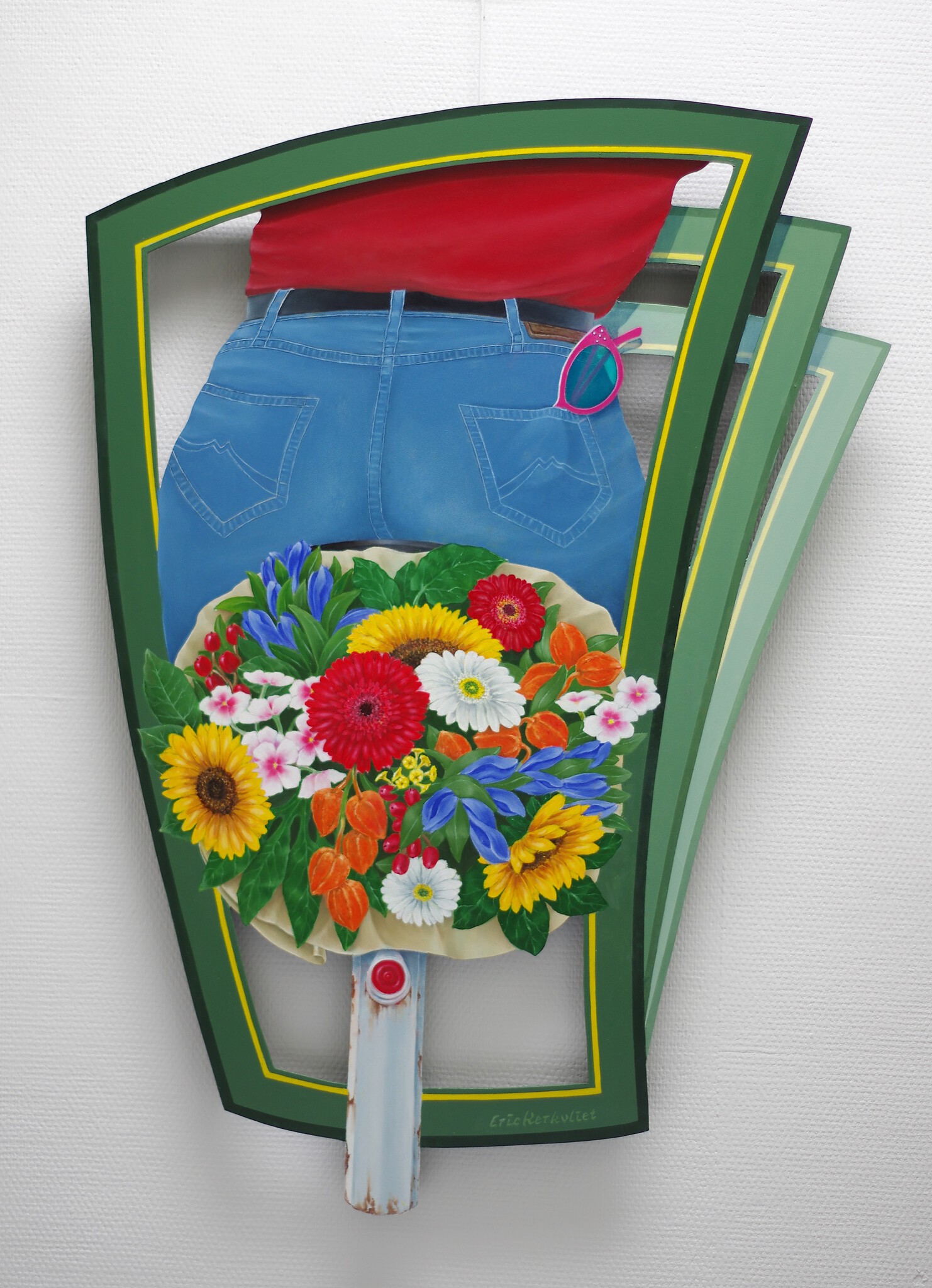 Eric Kerkvliet schildert met olieverf uiterst gedetailleerd voorstellingen op iets verhoogd paneel waardoor bij juiste belichting een Trompe-l’oeil-achtig effect ontstaat.