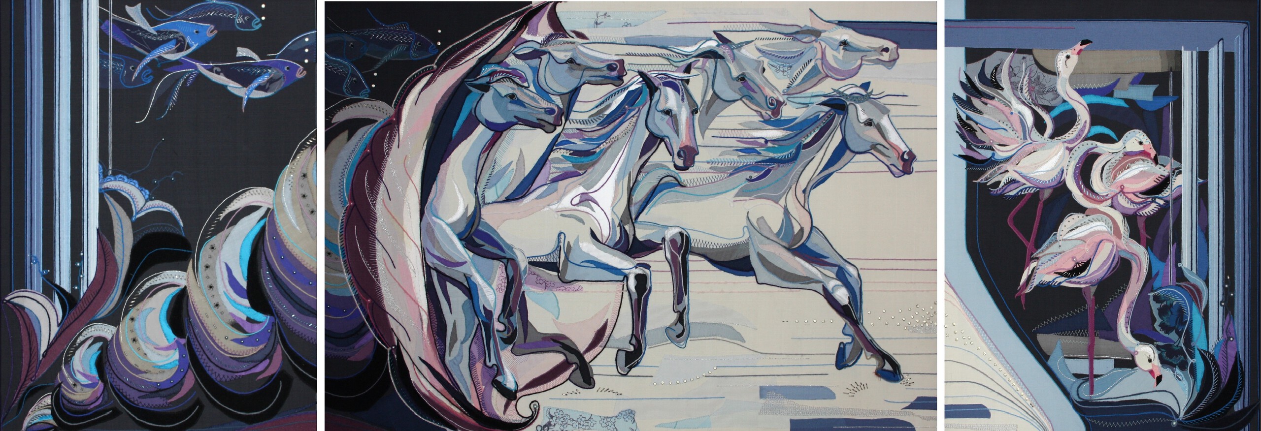 Drieluik zee met vissen en grote schelp waaruit paarden komen ( land) en vogels ( de lucht)