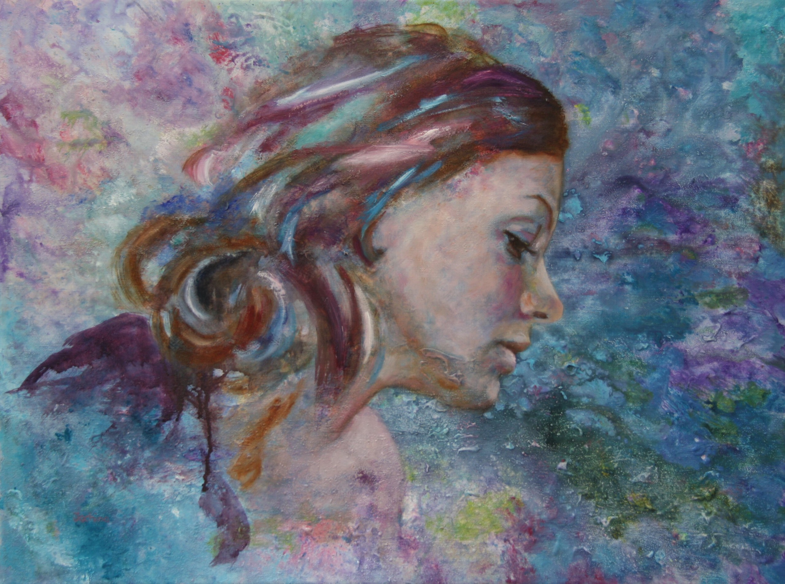 Dit kleurrijke portret in olieverf is geschilderd op een ondergrond van dikke en verdunde acrylverf.