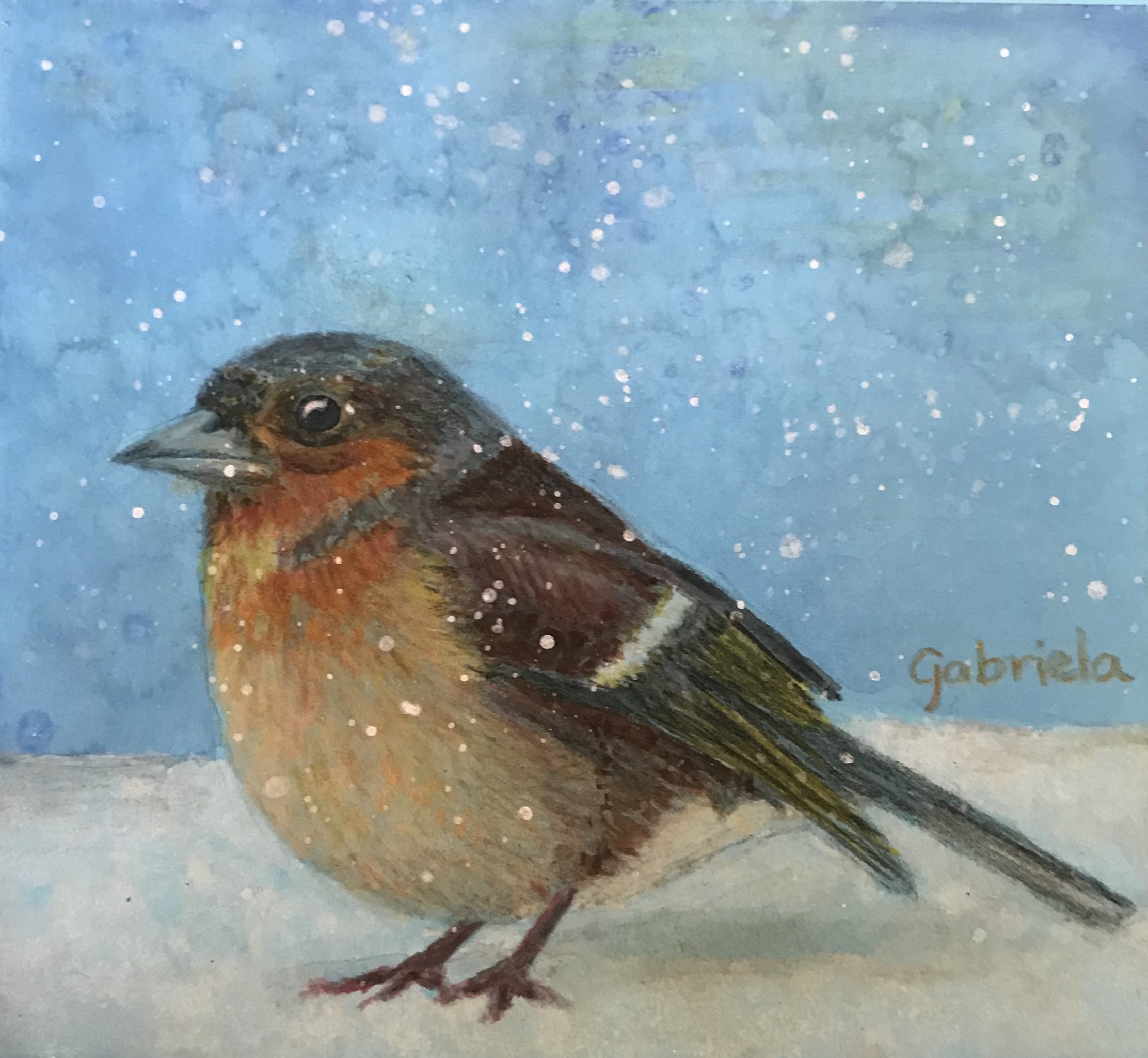 Tekening met kleurpotlood op blauw papier van een vink in de sneeuw.