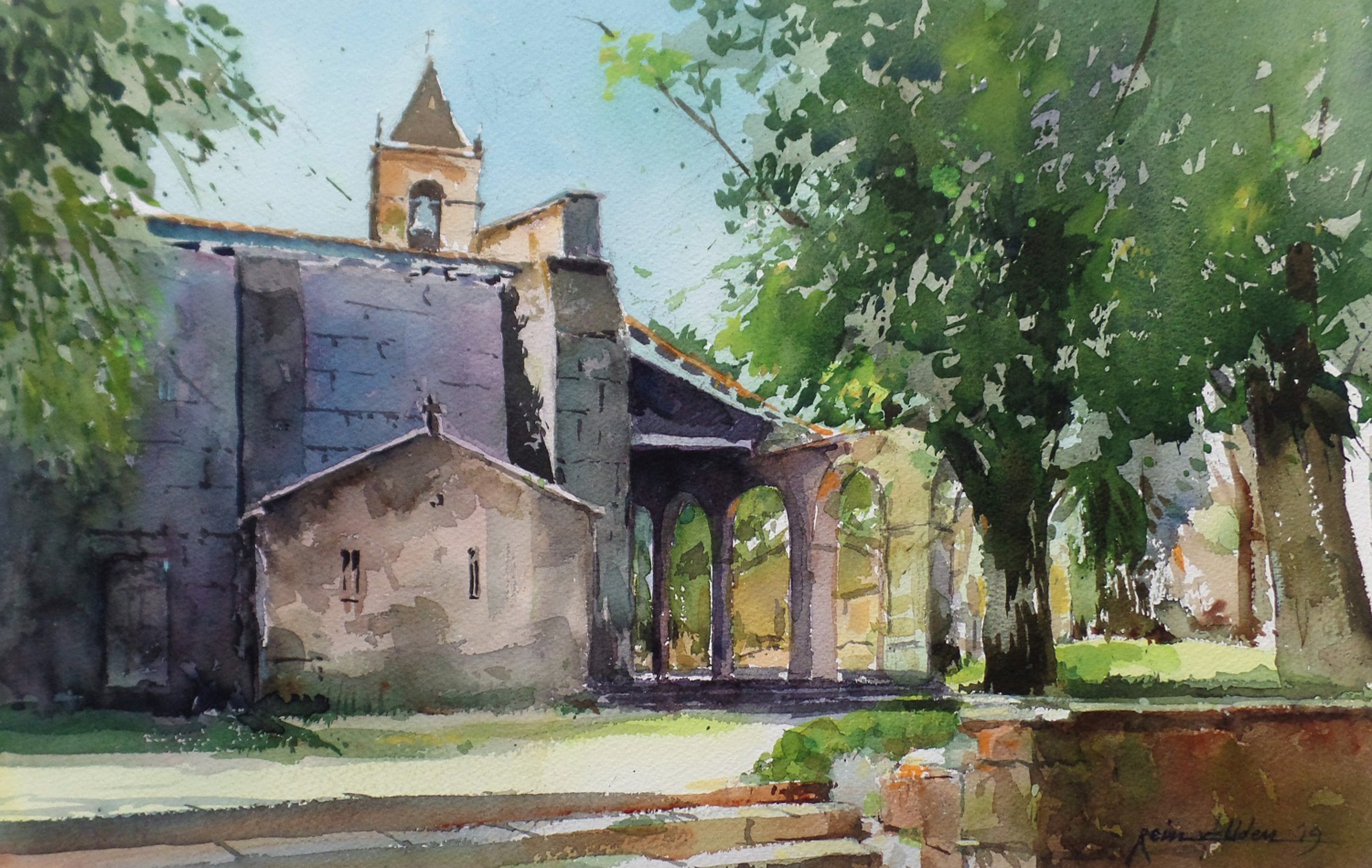 Kerk Finisterra Camino Santiago Aquarel