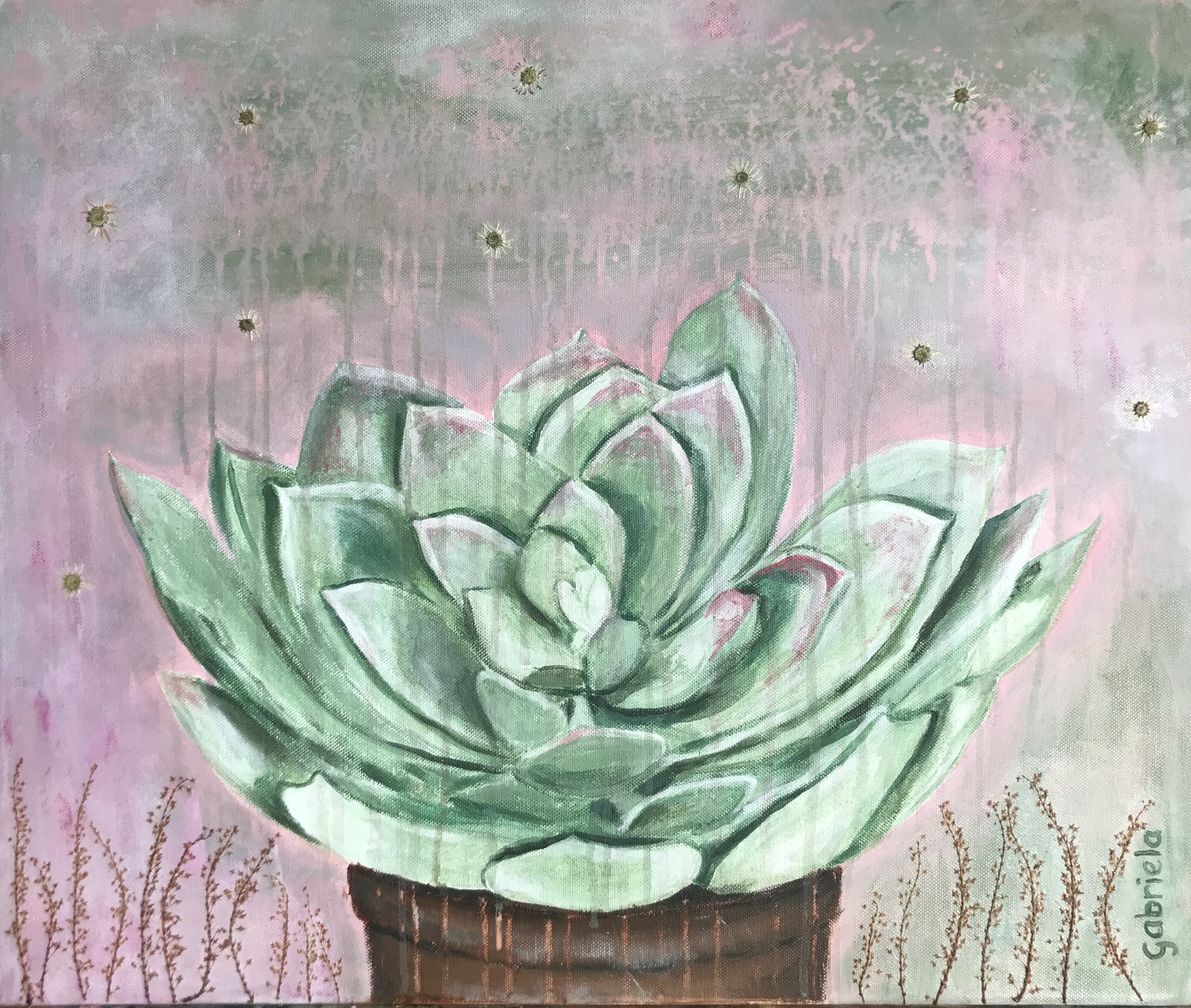 Schilderij van een echeveria. Geschilderd met acrylverf. Op schilderij zijn ook droogbloemen verwerkt (madeliefjes)