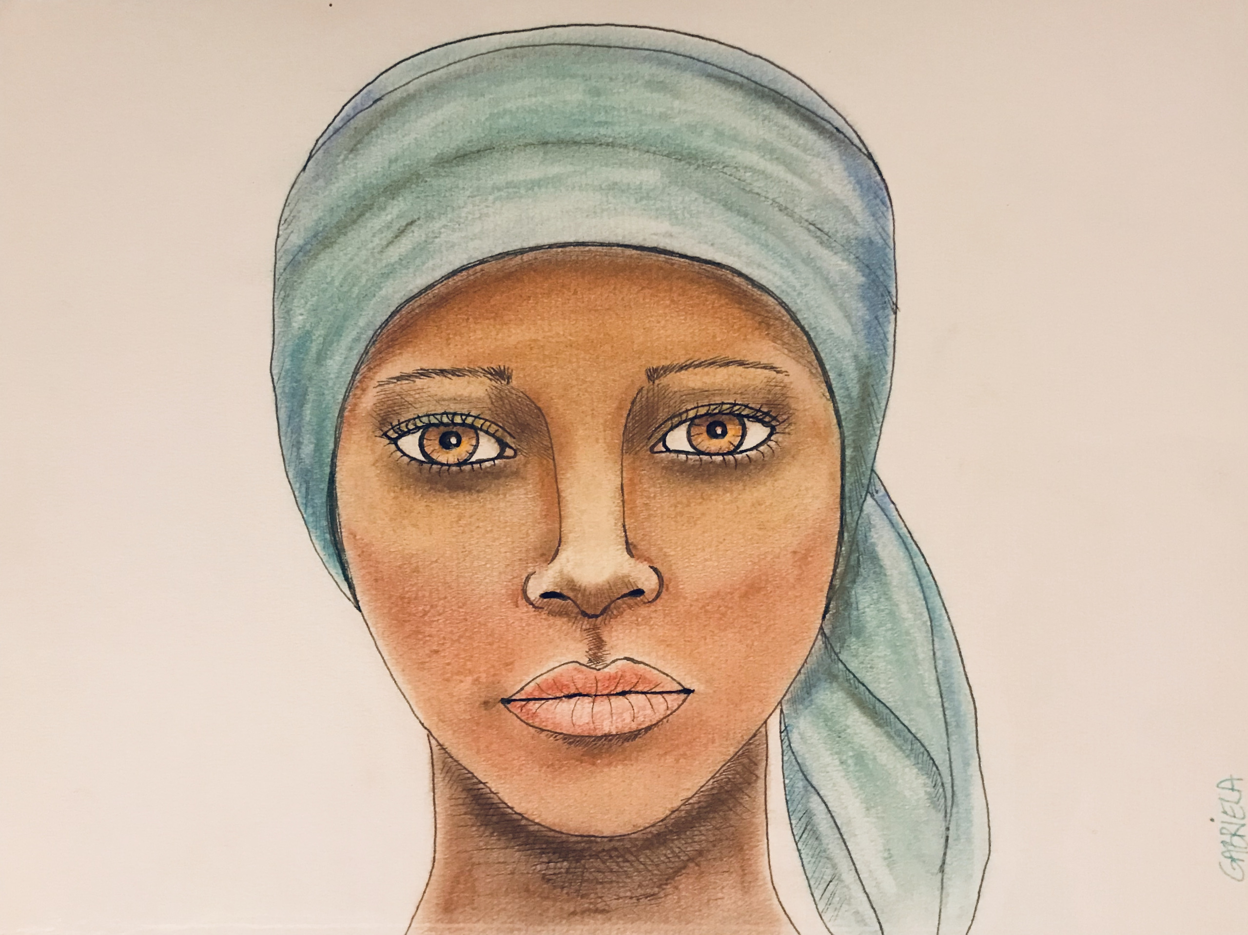 Pentekening en kleurpotlood van een Afrikaanse vrouw op aquarelpapier.