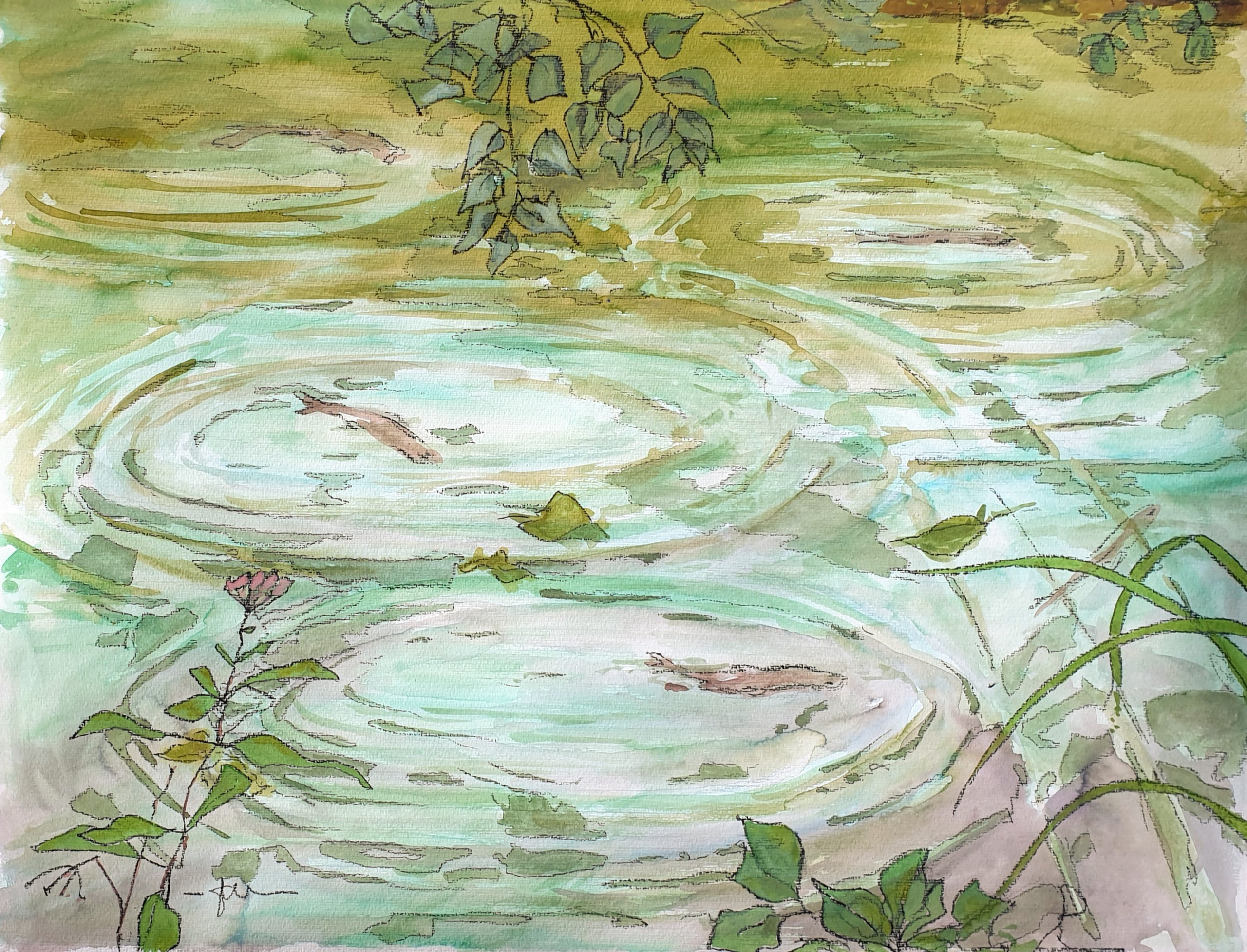 Deze kleine vissen zijn een genot, hier en weg om de paar minuten, voortdurend bezig. Een heel klein deel van de grote tuinen van het landhuis. Aquarelle, houtskool