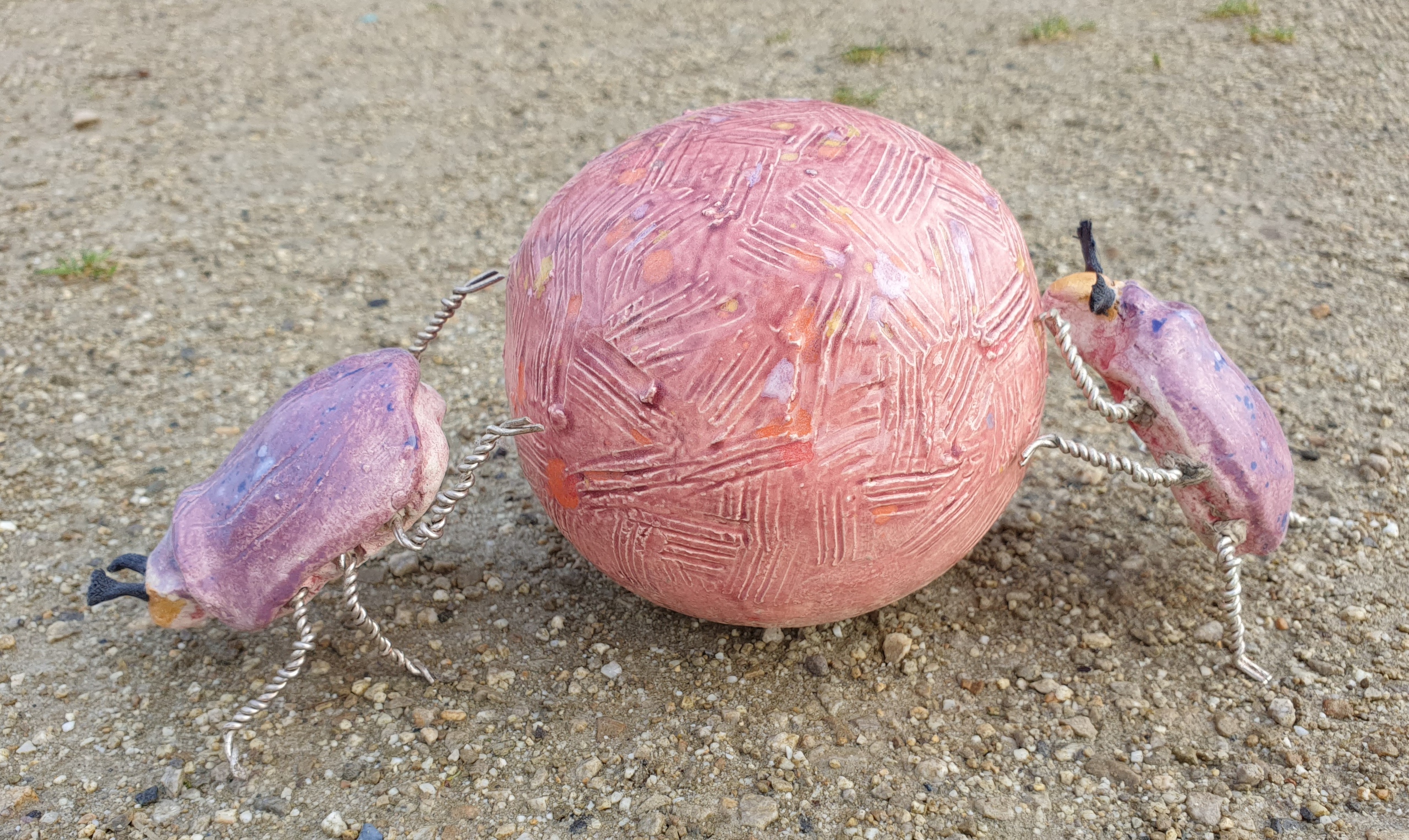 Twee mestkevers met mestbal. Keramiek, poten van zilverdraad, sprieten van textiel.