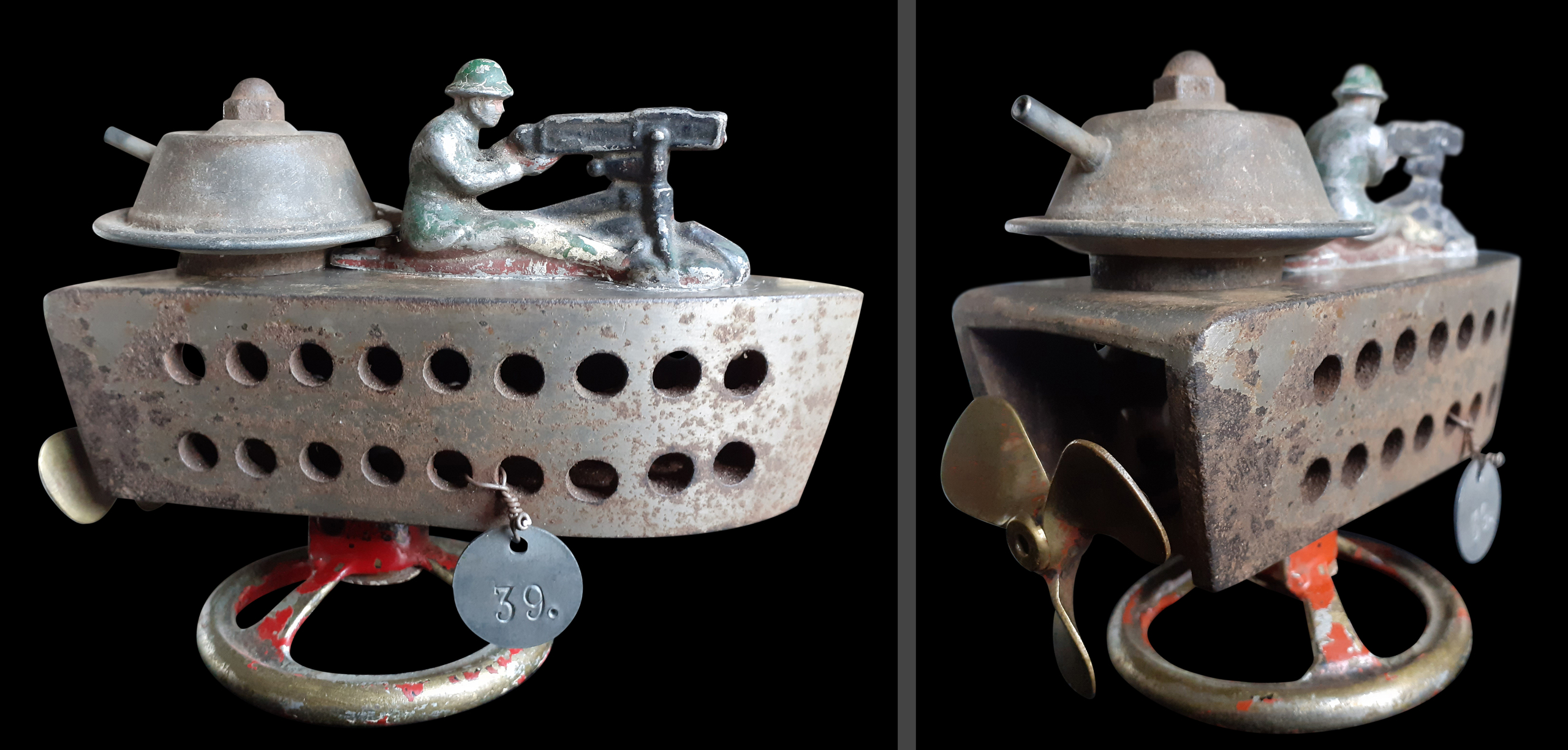 Slagschip van kleine strijkbout met aluminium speelgoedsoldaatje en diverse onderdelen