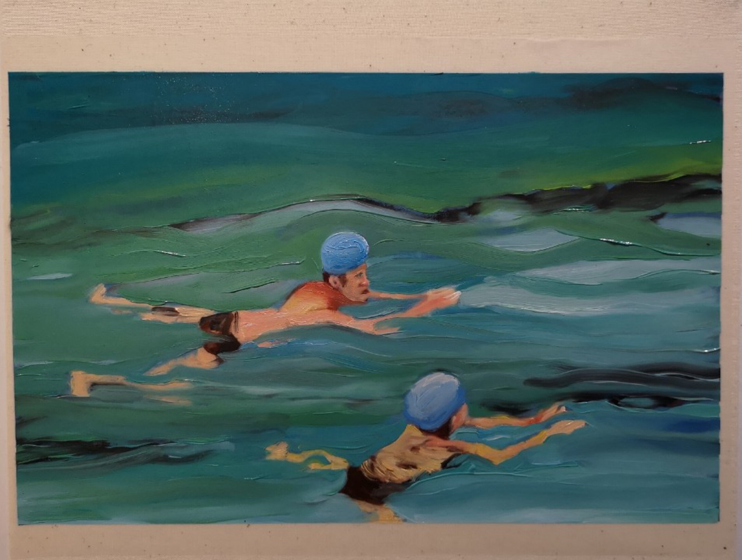 Schilderij Blauw Water Olieverf Zoon Zwemmen Vader Zwembad Badmuts