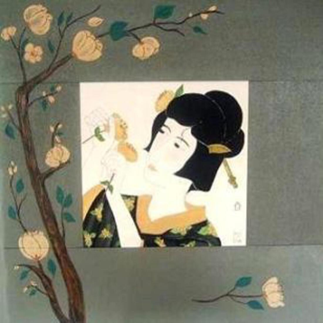 Japanse Geisha met lente bloesem Geinspireerd door Japanse prenten Techniek aquarel guache op aquarelpapier Achter bechilderd houten passepartout beschilderd met lentebloesem in acryl Maat 100 x 100 cm