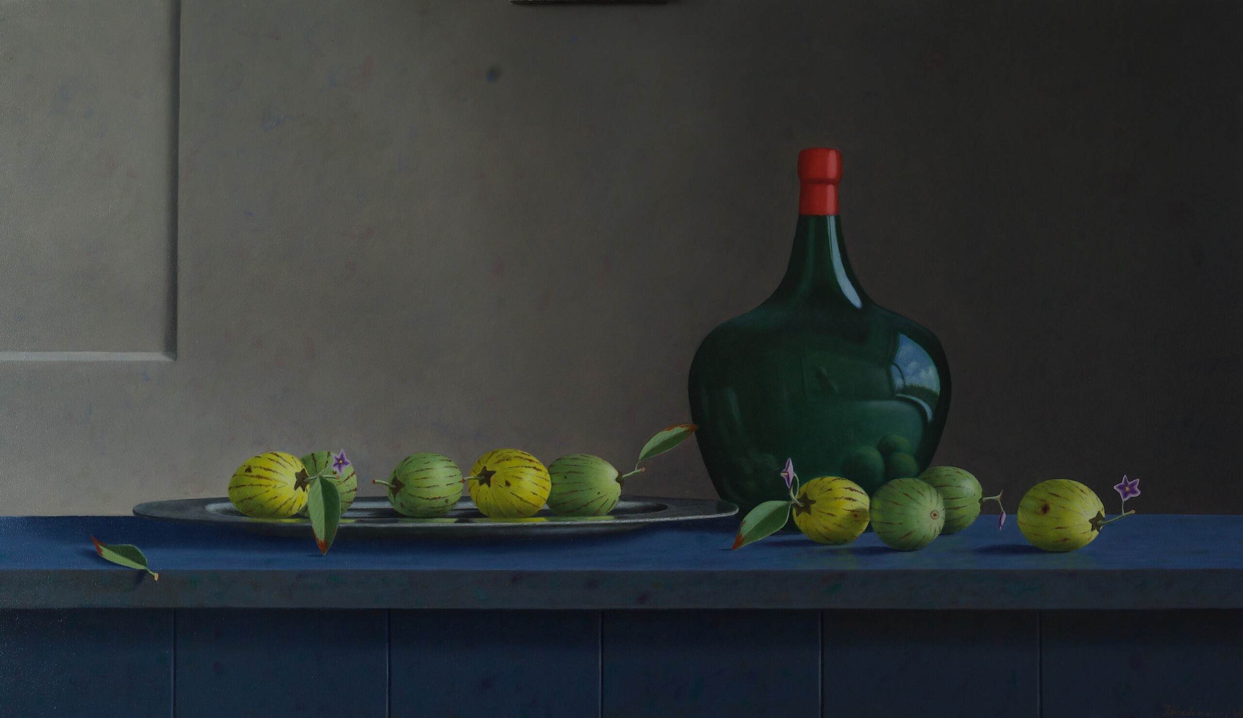Het stillevren wordt gevormd door de gele en groene meloenperen met de groene karaf.