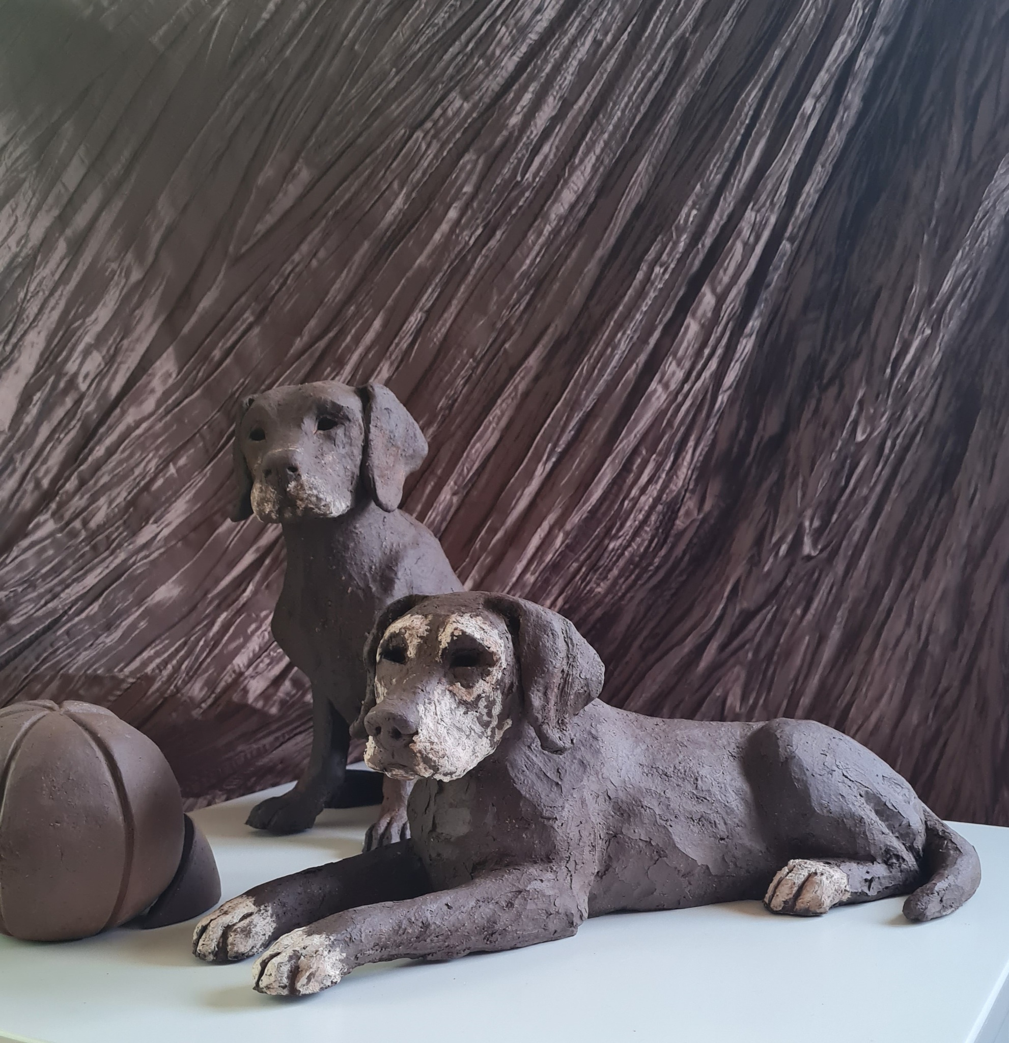 Twee bruine labradors in opdracht. In de bal kan de as van één van de honden, die inmiddels overleden is.