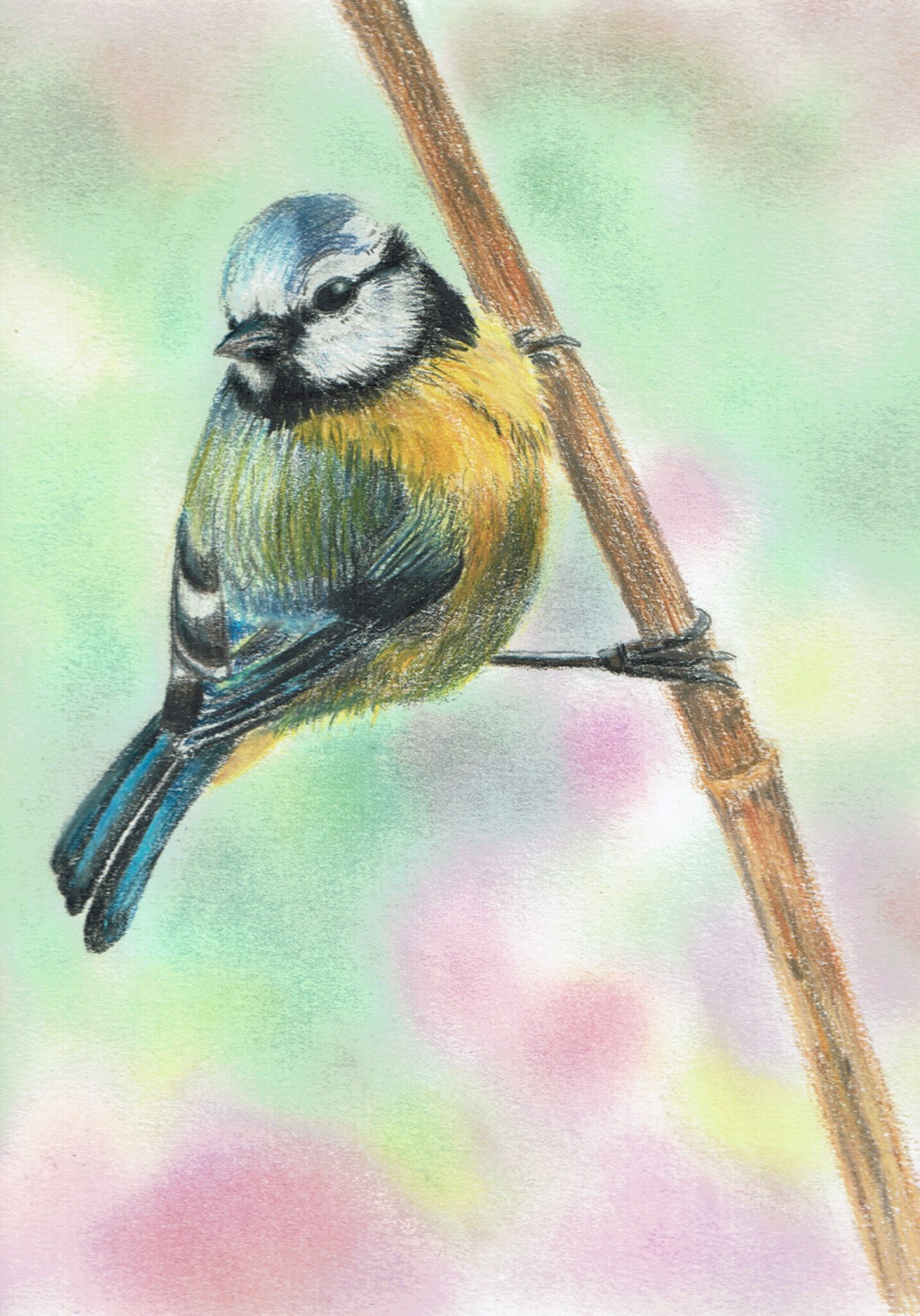 Vogel Natuur Pimpelmees Lente Pastelpotlood Groen Geel Blauw Realistisch