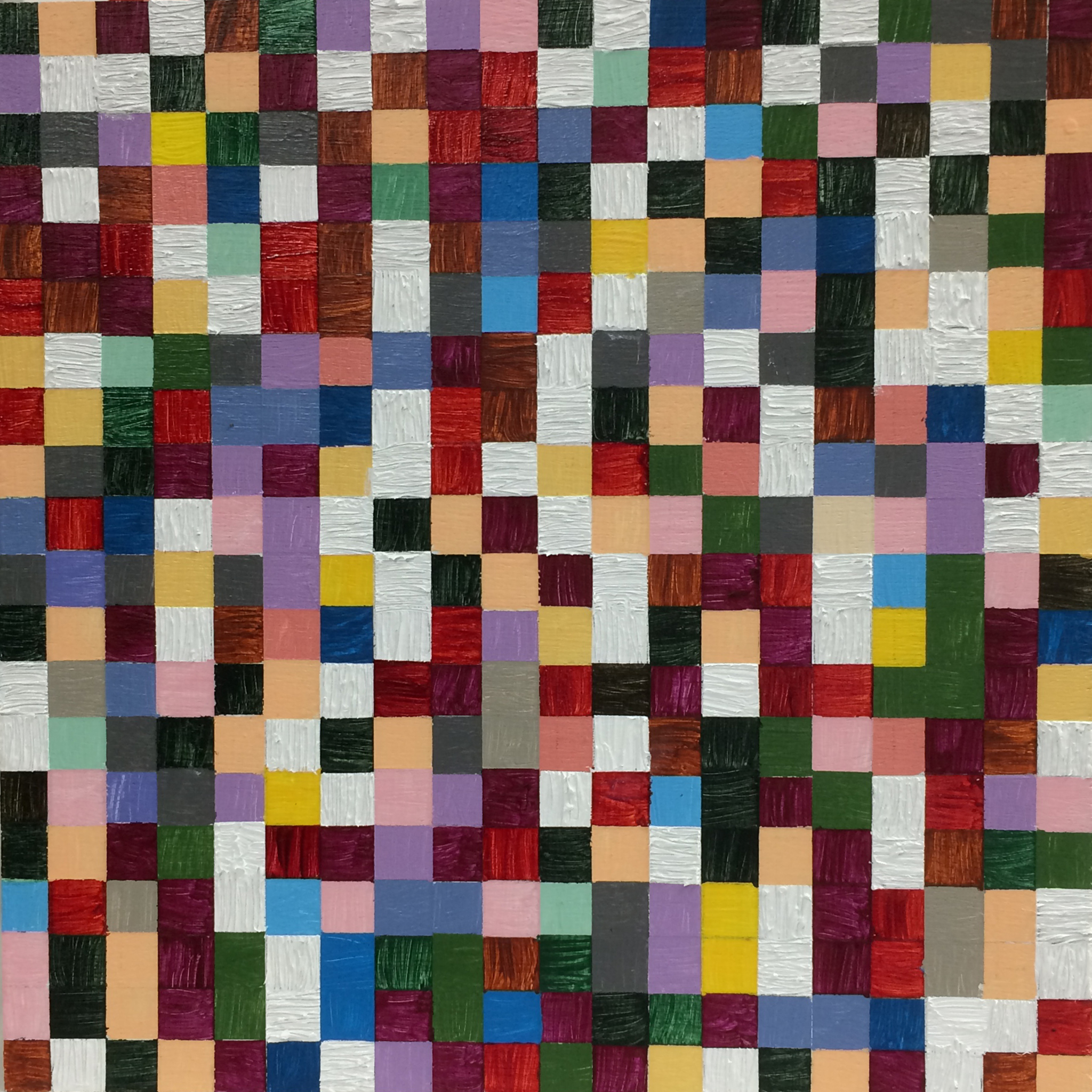 Thema: Chaos (Geometrische Chaos) Mijn kunst is beïnvloedt door de moderne wiskundige en wetenschappelijke benadering van het begrip complexe orde van de natuur. Met name heb ik me verdiept in de Chaos theorie en de fractal geometrie. Ik ben geen wiskundige, en ik gebruik geen wiskundige formules. De ideeën van de Chaos theorie en fractal geometrie leiden tot de ontwikkeling van de composities in mijn werk. Ik gebruik driehoeken,vierkanten en cirkels in mijn schilderijen, maar in mijn huidige serie, geoChao richt ik me alleen op de vierkanten en de verhoudingen tussen de vierkanten. Ik ontwikkel mijn composities door kleine vierkantjes op grote te zetten of grote op kleine te zetten. Het gaat om de onderlinge verhoudingen tussen de vierkanten. Ik laat de methode die ik kies de compositi