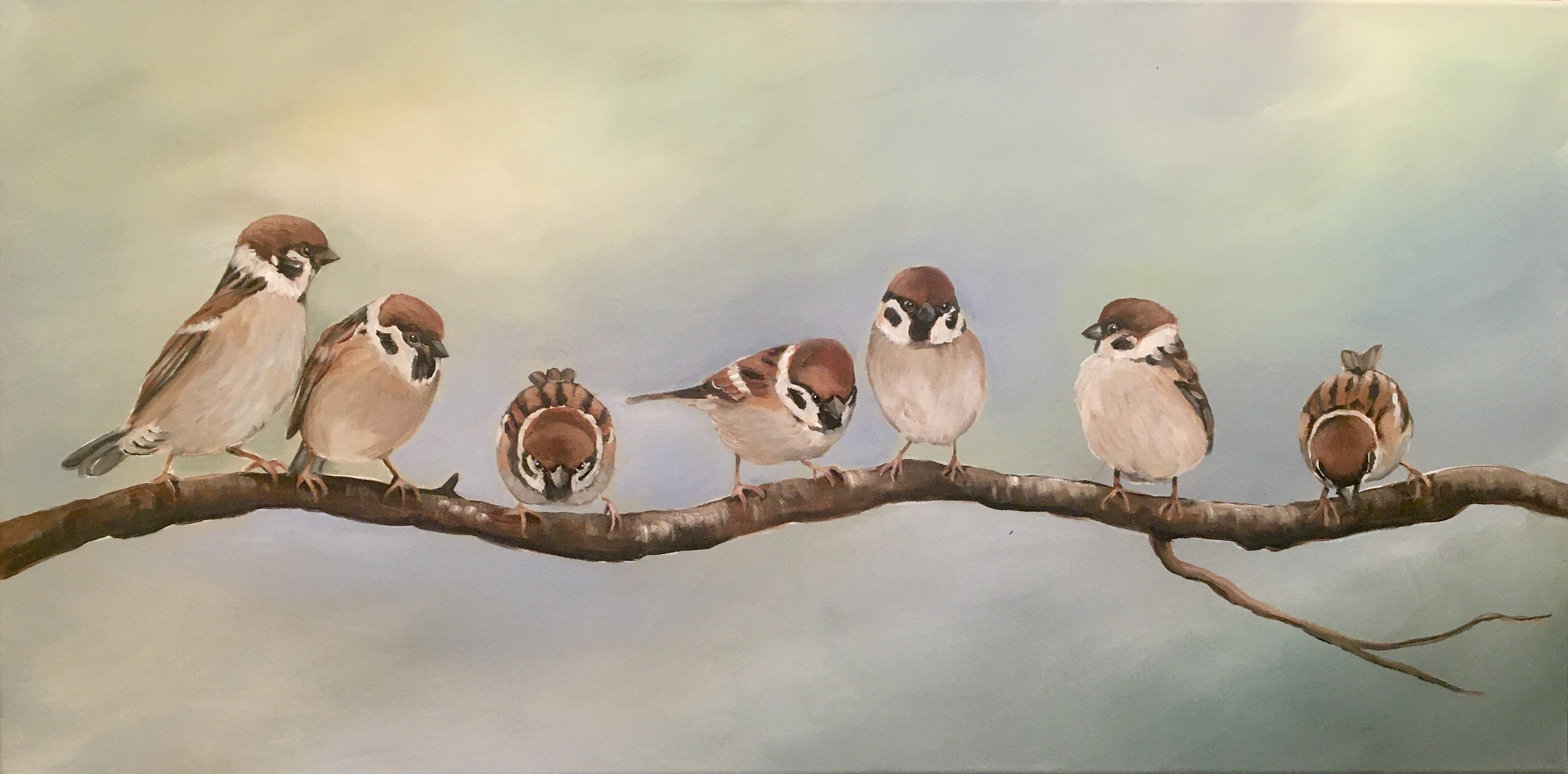 Mus Mussen Natuur Natuurlijk Tak Blauw Groen Lichtblauw Ochtendlicht Vogel Vogelschilderij Schilderij Acryl Acrylverf Sparrow Sparrows