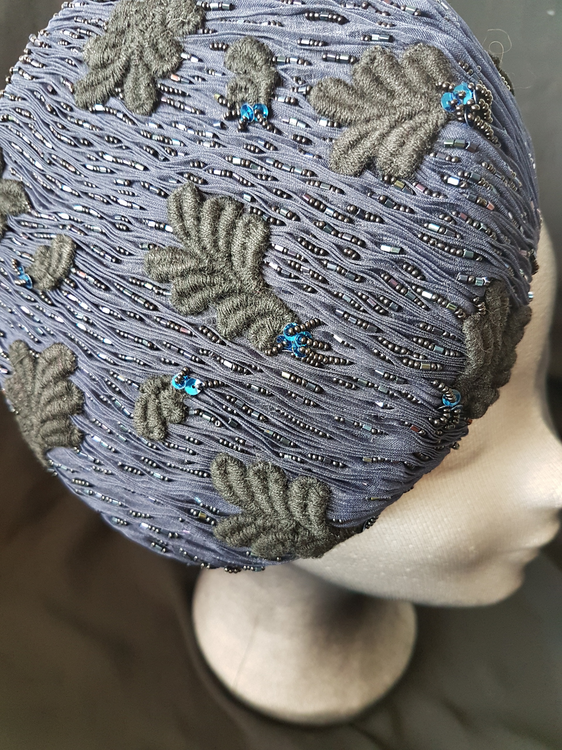 Haute Couture borduurtechnieken op geplisseerde zijde, verwerkt om een fascinator van sinamay. De binnenkant is bekleed met zijde.