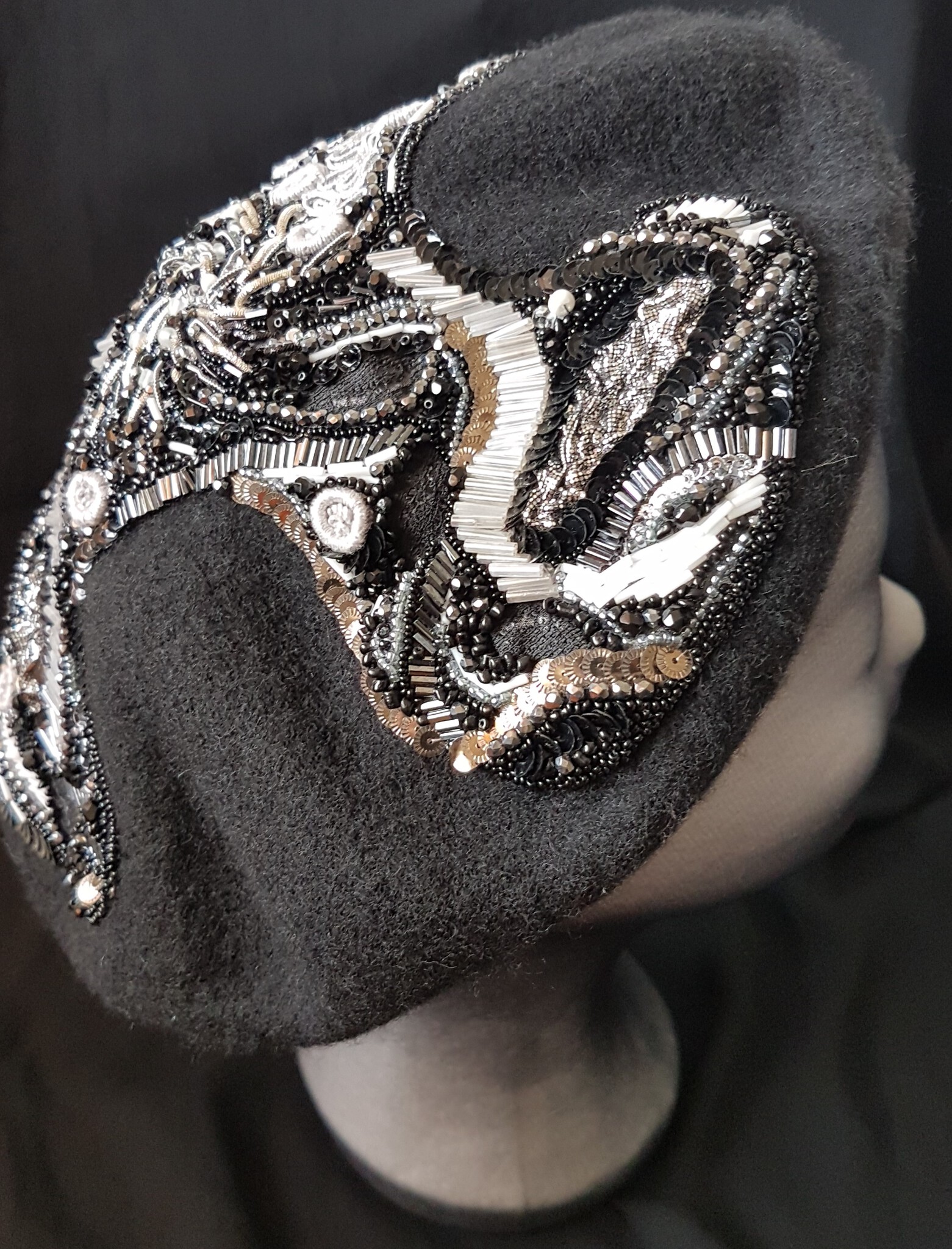 Haute Cuture en goudborduurtechnieken op zijde. Afgewerkt op een wollen baret.