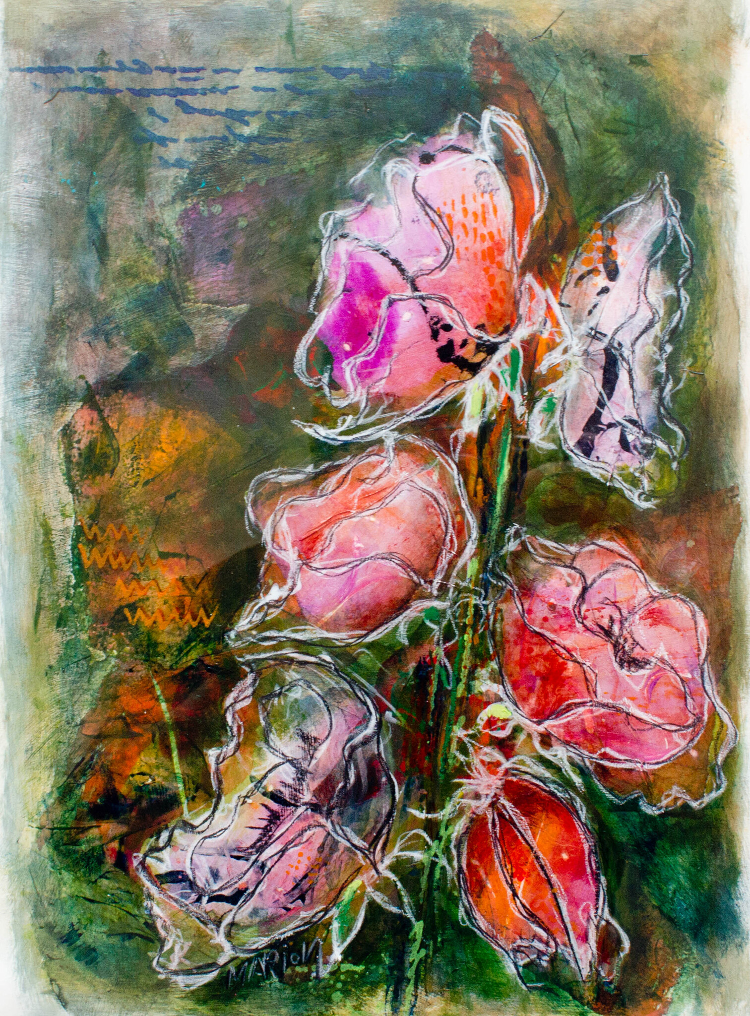 In dit werk ben ik aan de slag gegaan met Acryl, pastelkrijt en oliepastel. Heb collages toegepast en extra wat medium met toevoeging van vloeipapier.