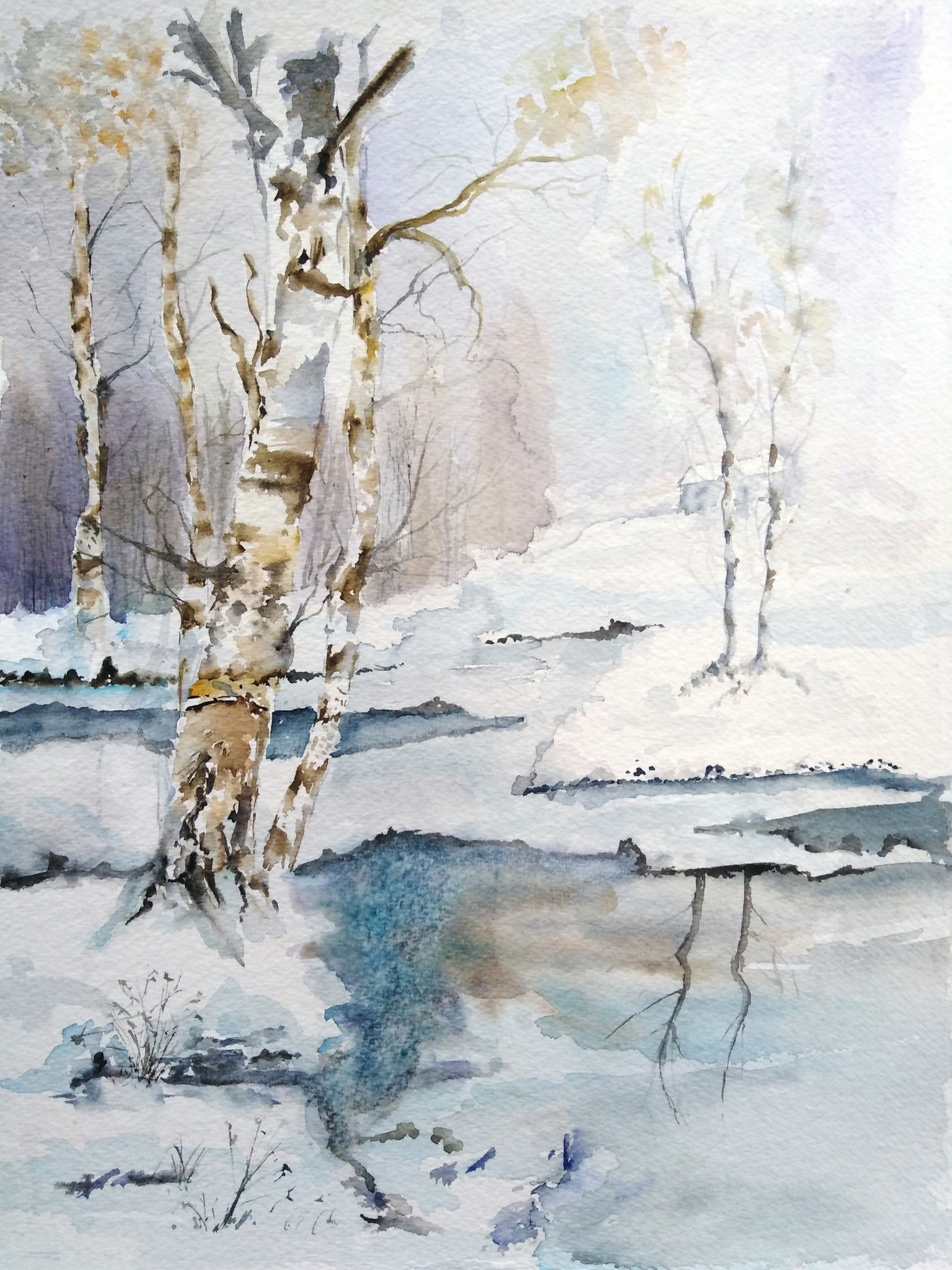 Huis Grijs Blauw Oker Paars Bruin Water Sneeuw Takken Berkenbomen Plantjes
