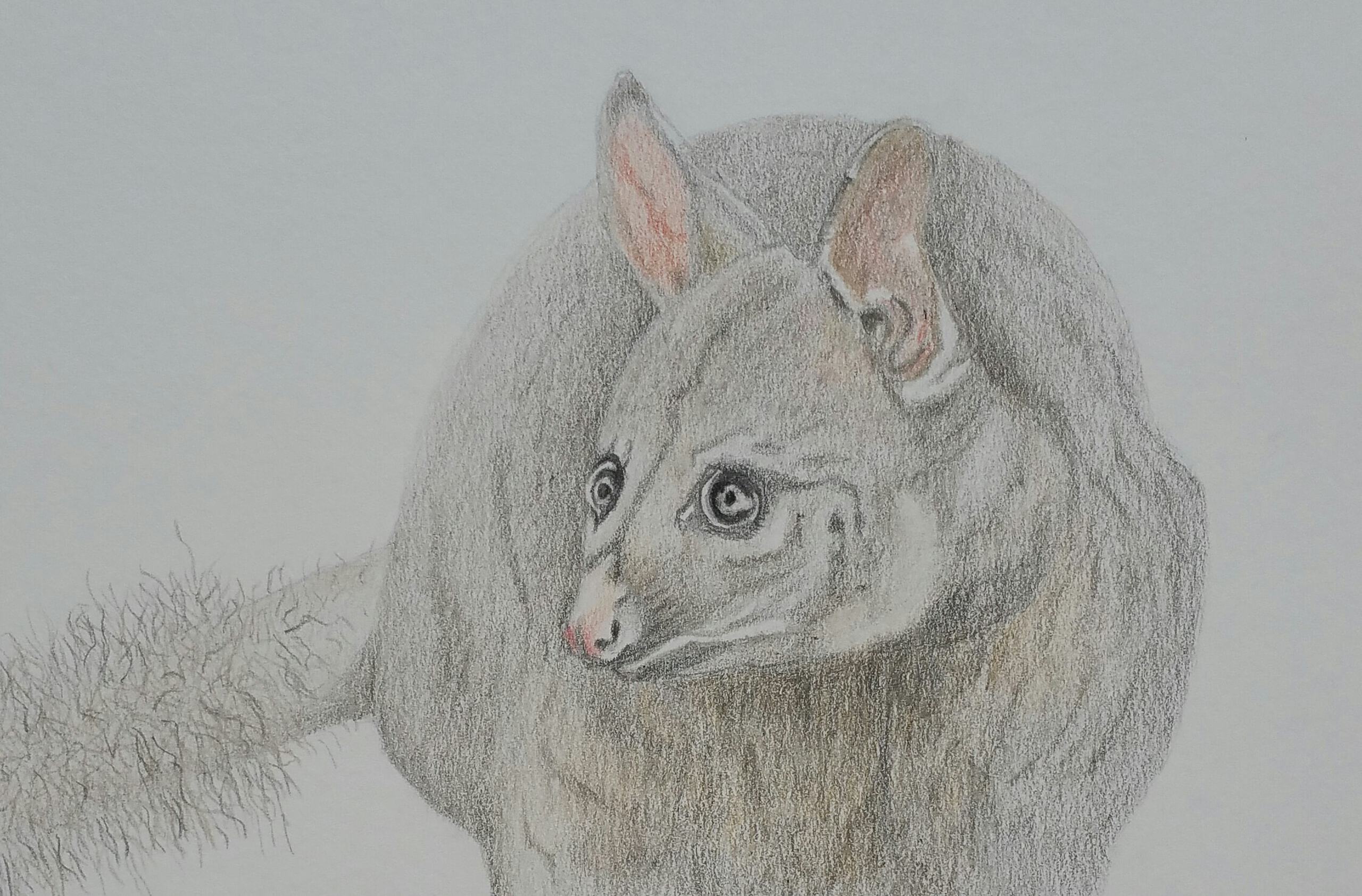 Een australische opossum. Een buideldier. Getekend met kleurpotloden.