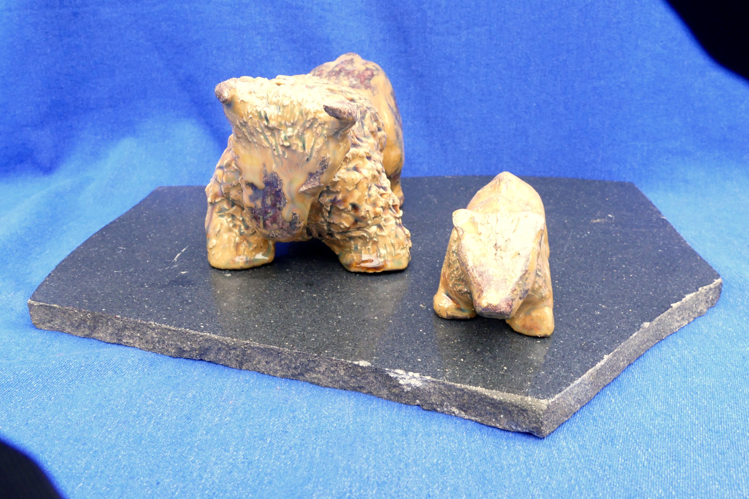 Buffel met jong op natuurstenen ondergrond. Zijn los te verplaatsen naar eigen wens. Grote Buffel 20 cm, jonge buffel 10 cm