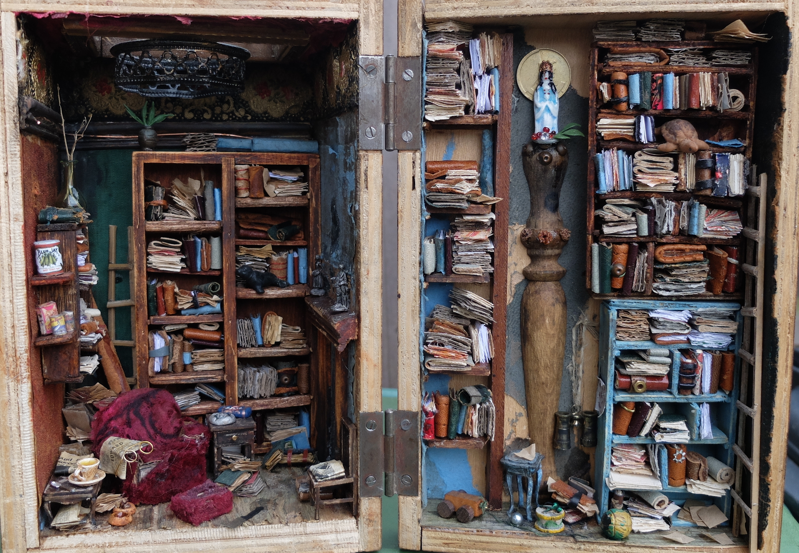 Miniatuur interieur in Bohemiaanse stijl met heel veel boekjes, een oude fauteuil, meubeltjes en boekenkasten