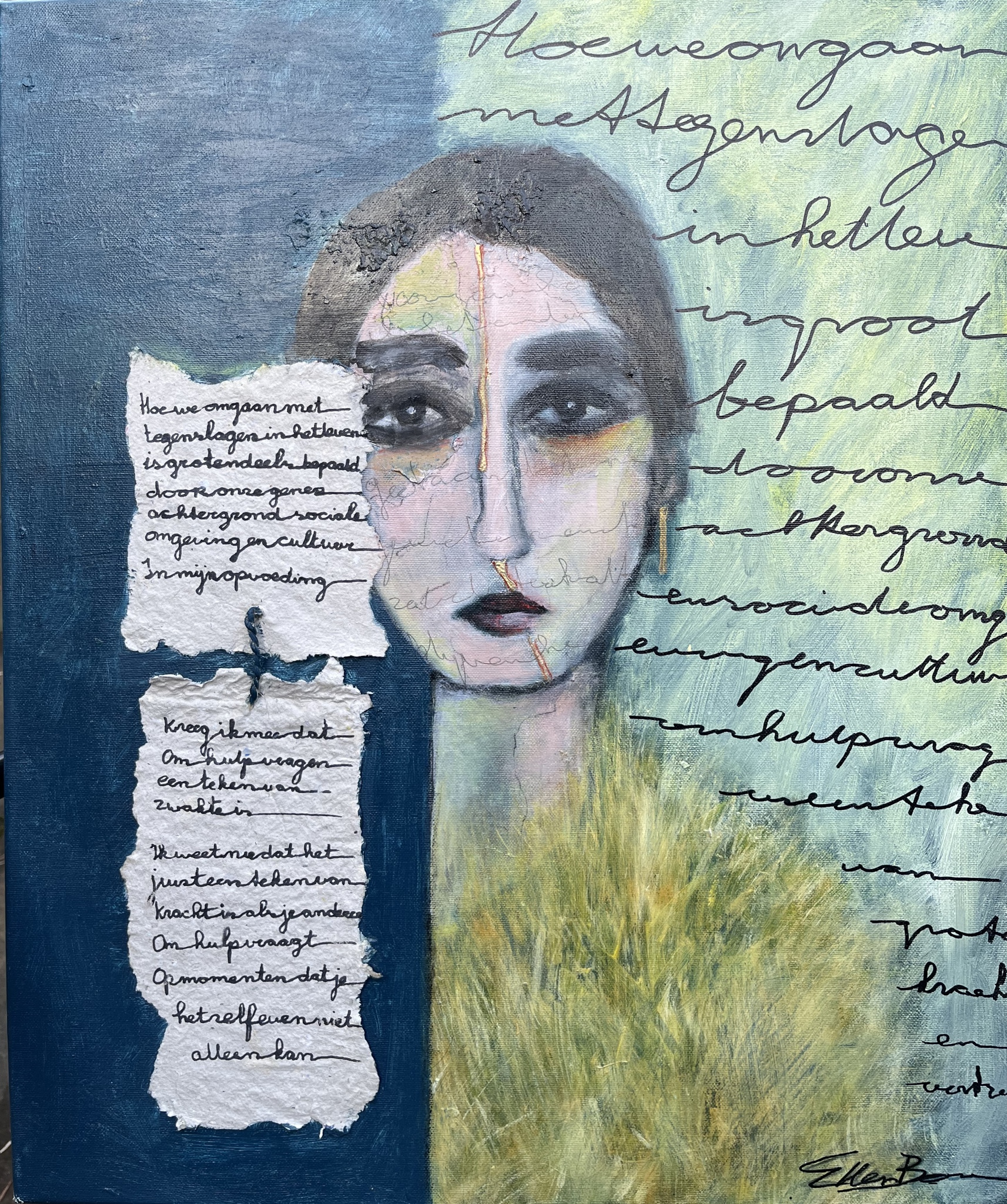 Ellen Berens (1960). Haar sterfelijkheid is wat haar bezighoudt in het leven, het gaat over vooruitgang door loslaten en anders denken en het erkennen van verliezen. Zij is een echte expressionist en staat voor het 'uitdrukken' van gevoelens. Ellen maakt met haar hoofd en handen wat er speelt in haar hart, na de diagnose ongeneeslijk kanker, dit is terug te zien in de schilderijen die ze maakt. Haar schilderijen hebben altijd meerdere lagen, zoals ook haar leven. Haar veelzijdigheid levert verrassende resultaten op. De combinatie van passie, articiteit en haar visie op het leven, maakt dat haar schilderijen symbolisch zijn met sprekende kleuren in harmonie met het onderwerp. Naast ervaringsdeskundige rond kanker is Ellen gediplomeerd in Creatieve therapie en Verlieskunde.