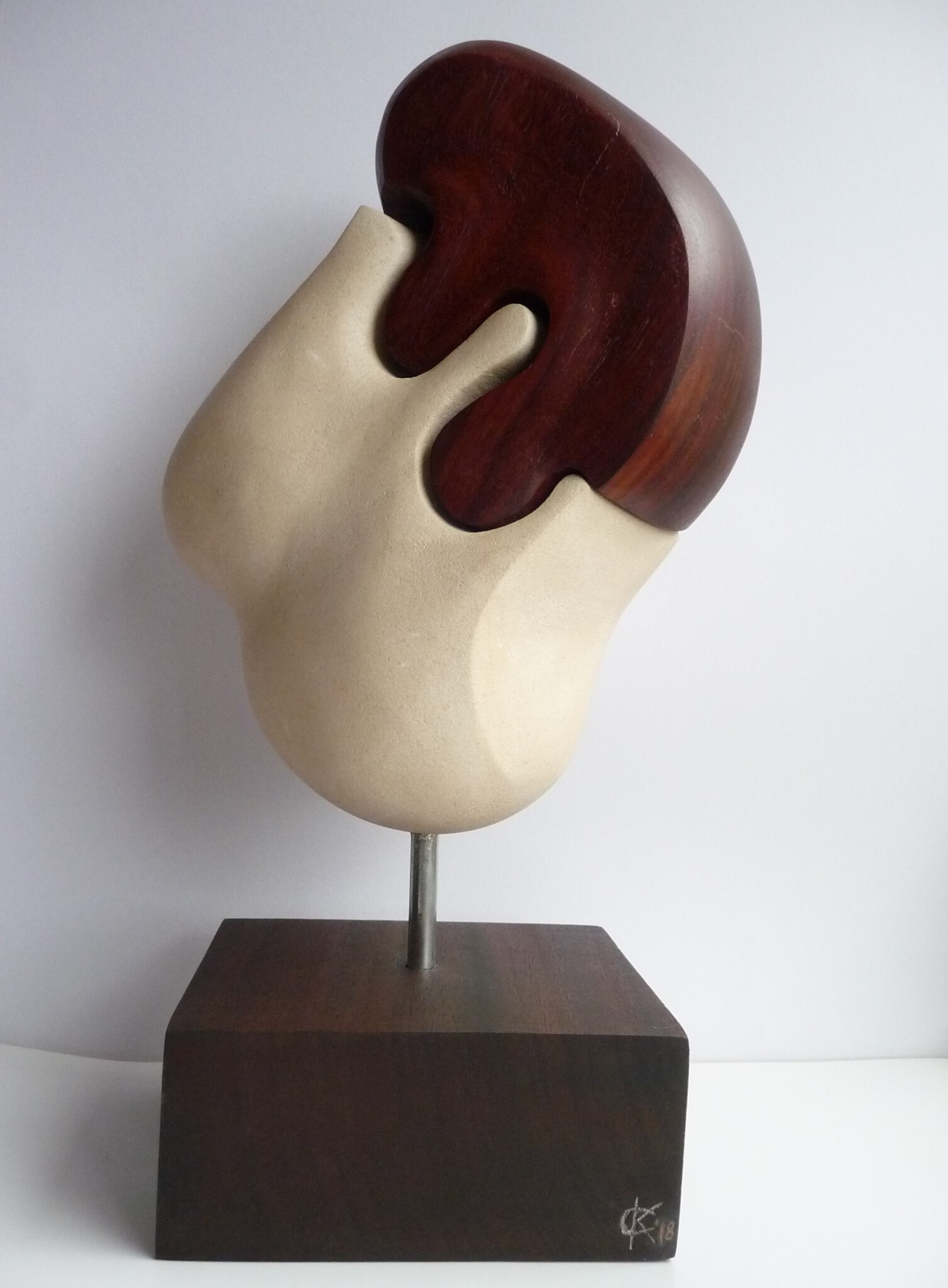 Combinatie Kalksteen (Pierre de lens) en hardhout (Paddoek) op een hardhouten sokkel. Convenit is Latijn en betekent; het past, het is samengekomen.