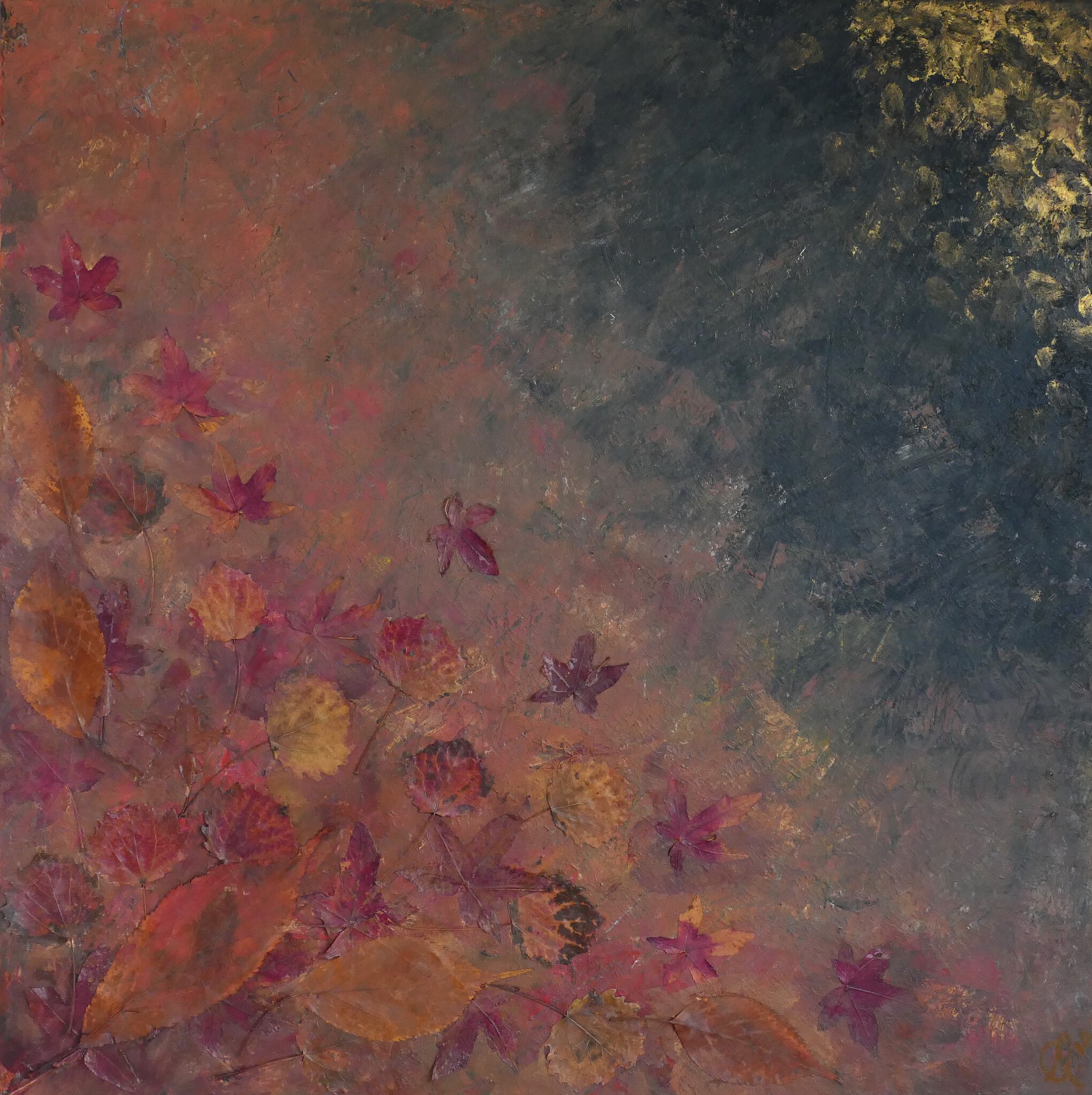 In de herfst van 2020 leefde het coronavirus weer op. De chaos die ik voelde verbeeldde ik met verf op het doek. Een paar dagen later wandelde ik met een vriendin door het herfstlandschap. Zij wees mij op herfstbladeren op de grond, rood met een zwarte rand. 'Deze kleuren er mooi bij, zei ze. We raapten een aantal bladeren en samen met herfstbladeren uit mijn tuin heb ik ze verwerkt in het doek.