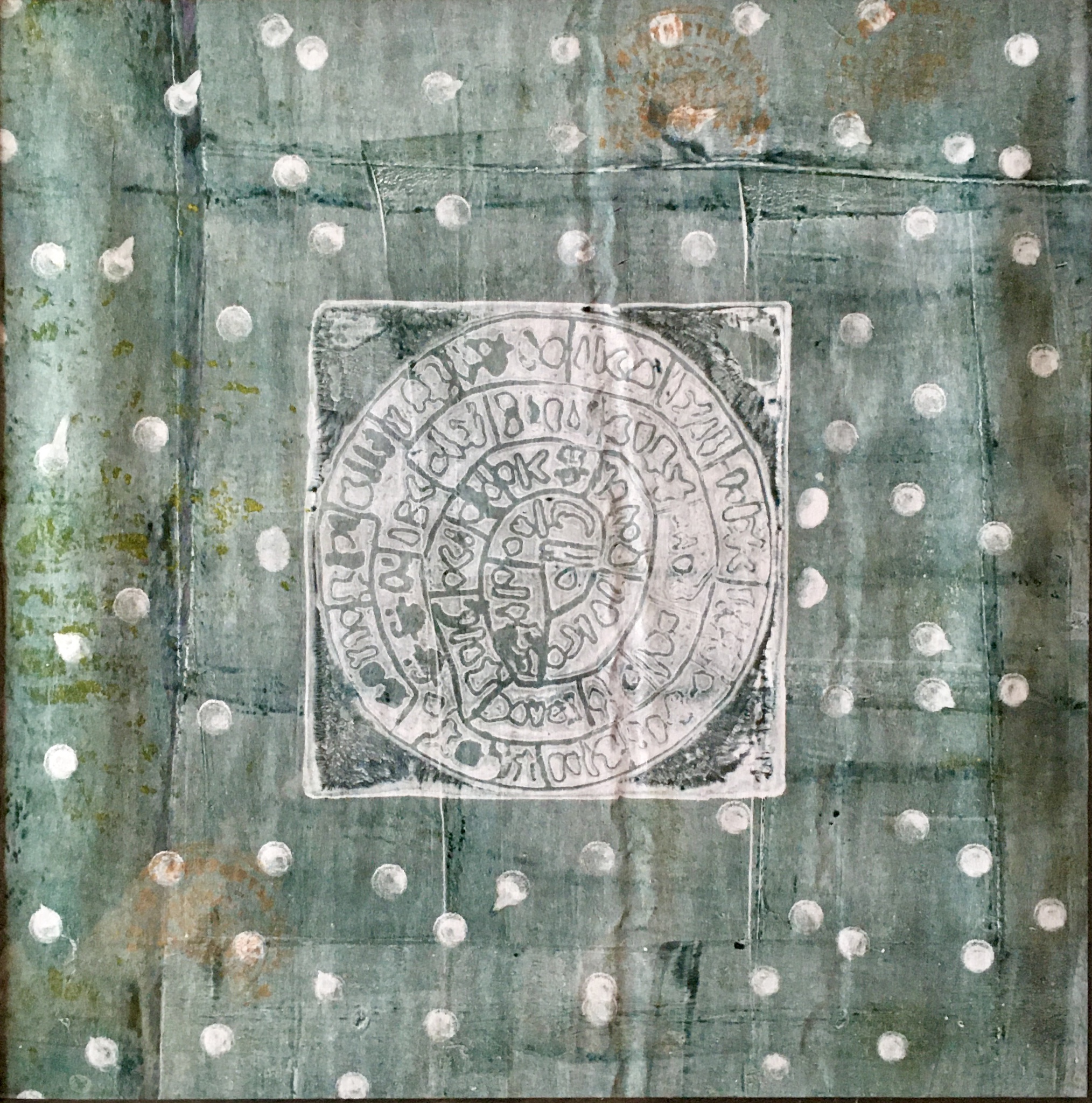 Monoprint in passepartout Het verhaal op een schijf van klei van een reis in een nog niet helemaal ontcijferde oud-griekse taal