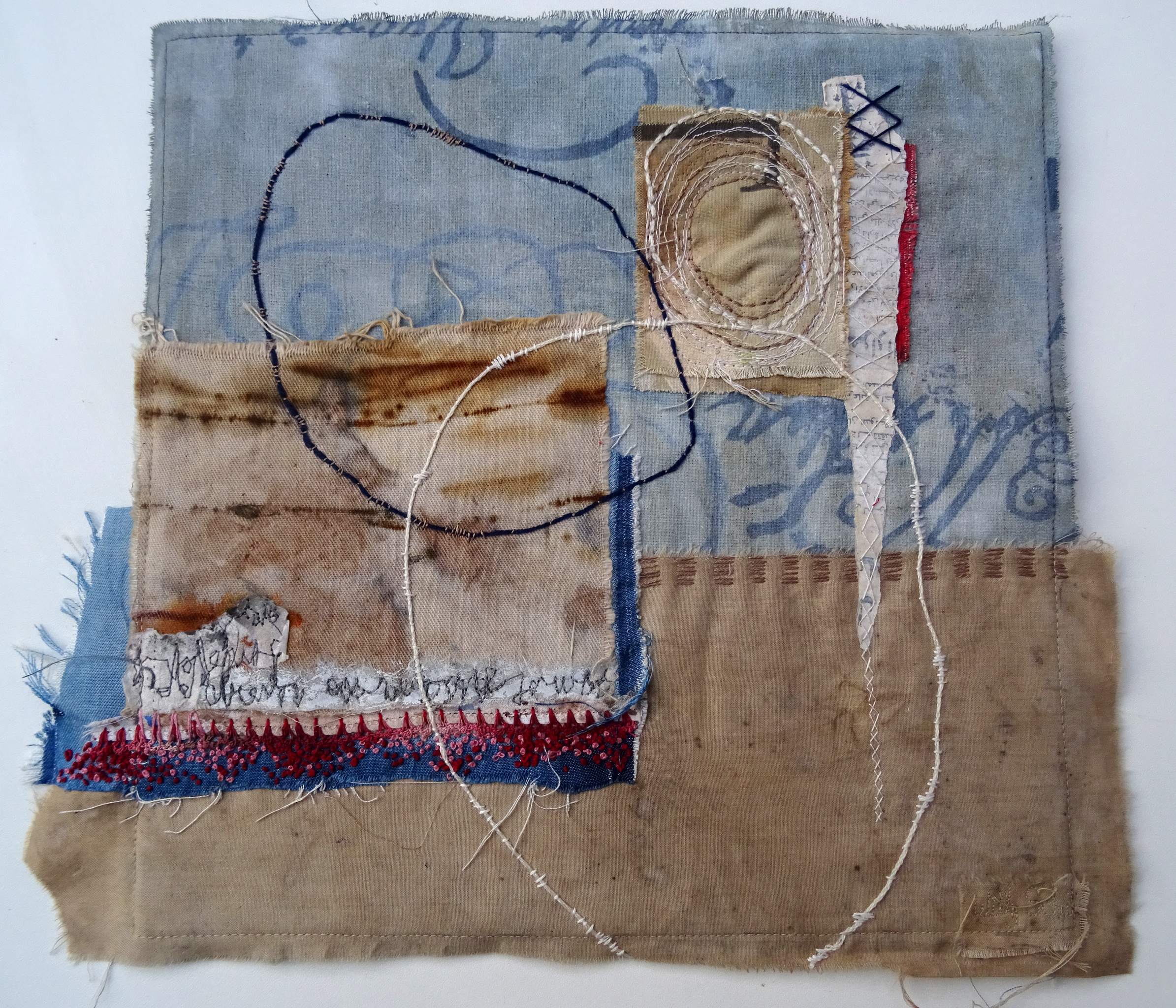 Abstract werk met stof, verf, papier, machinaal en handborduurwerk