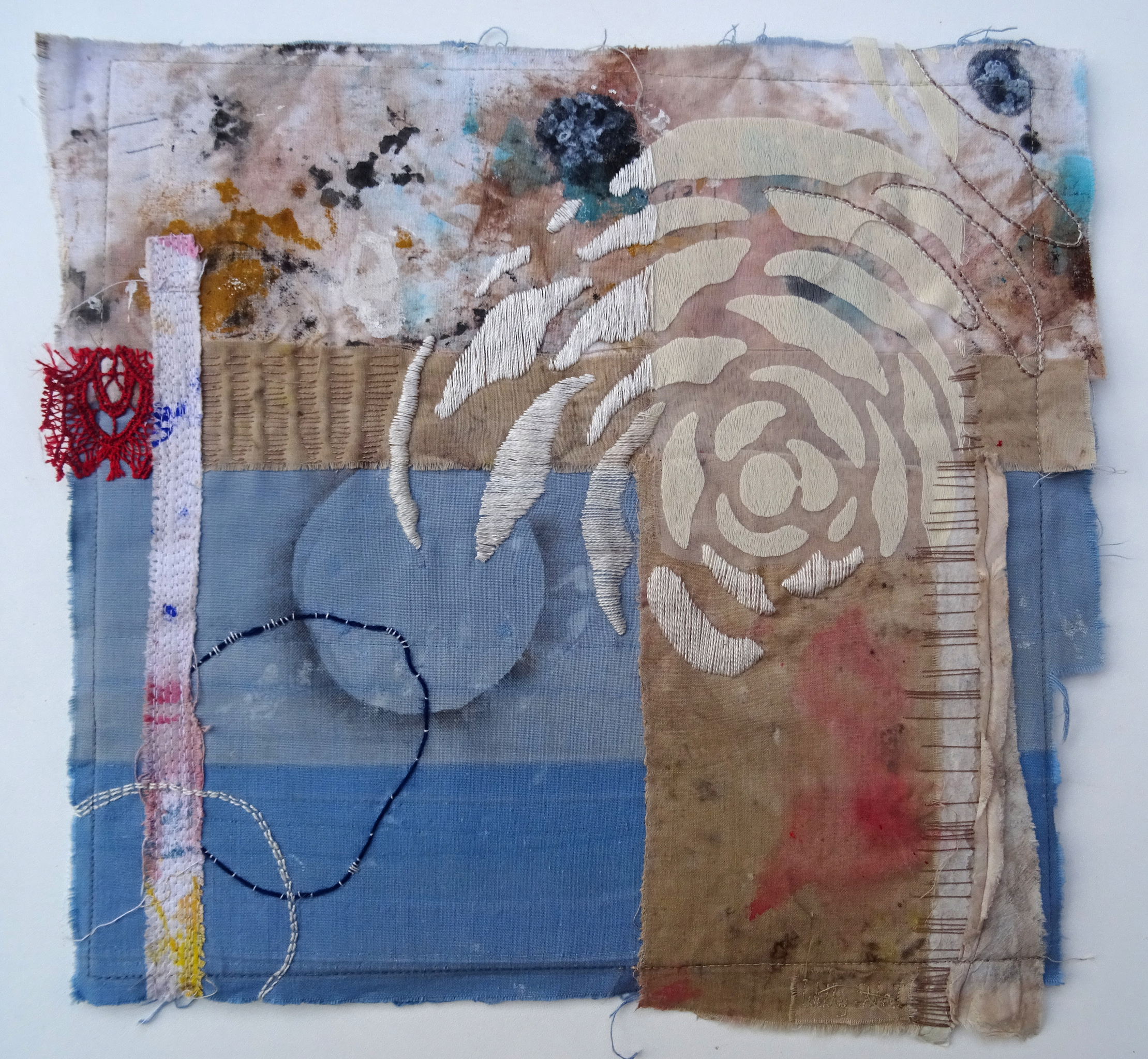 Abstract werk met stof, verf, papier, machinaal en handborduurwerk