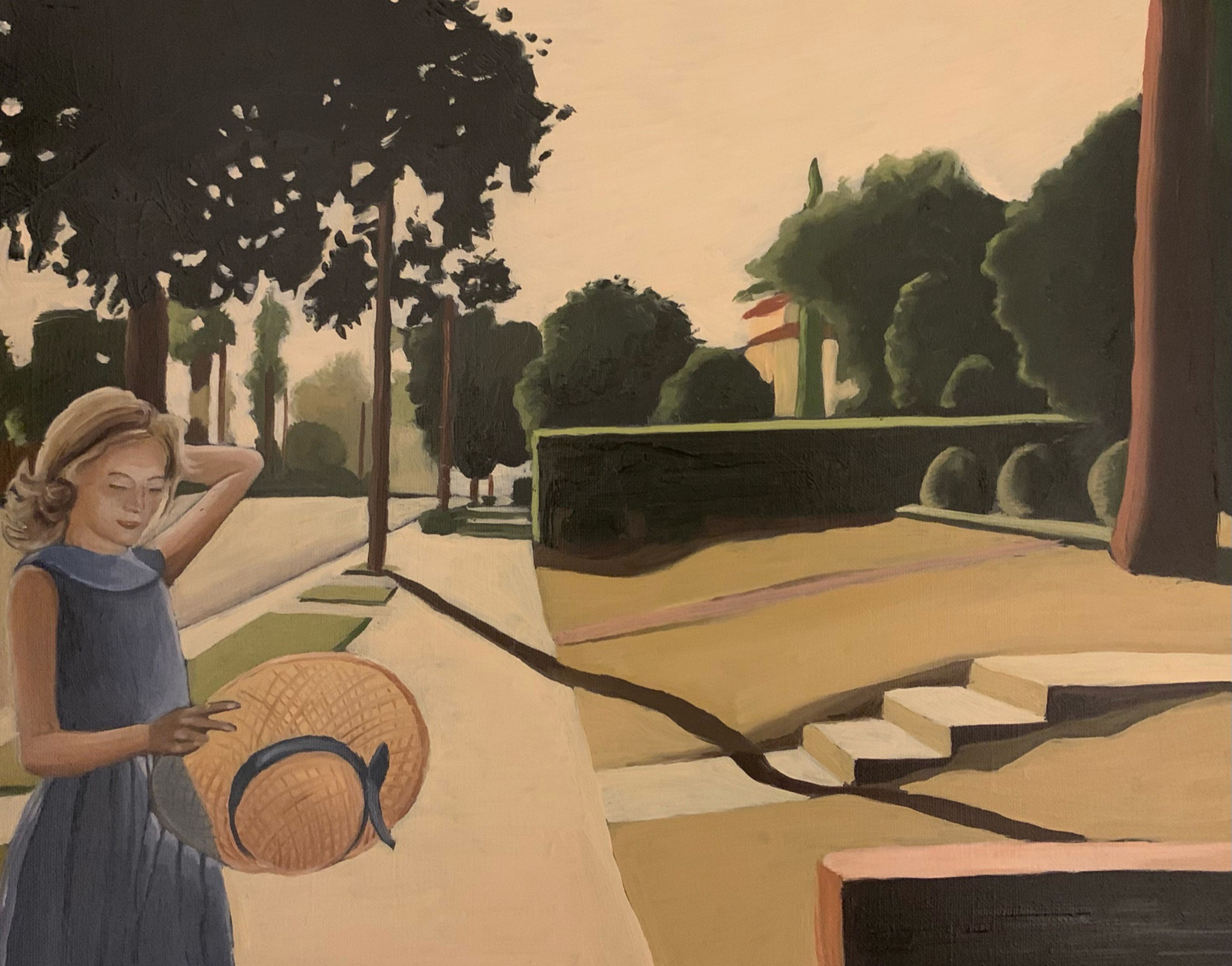 Het is een zonnige dag en schaduwen tekenen zich af in de straat. Een meisje laat het zonlicht in haar zonnehoed meespelen.