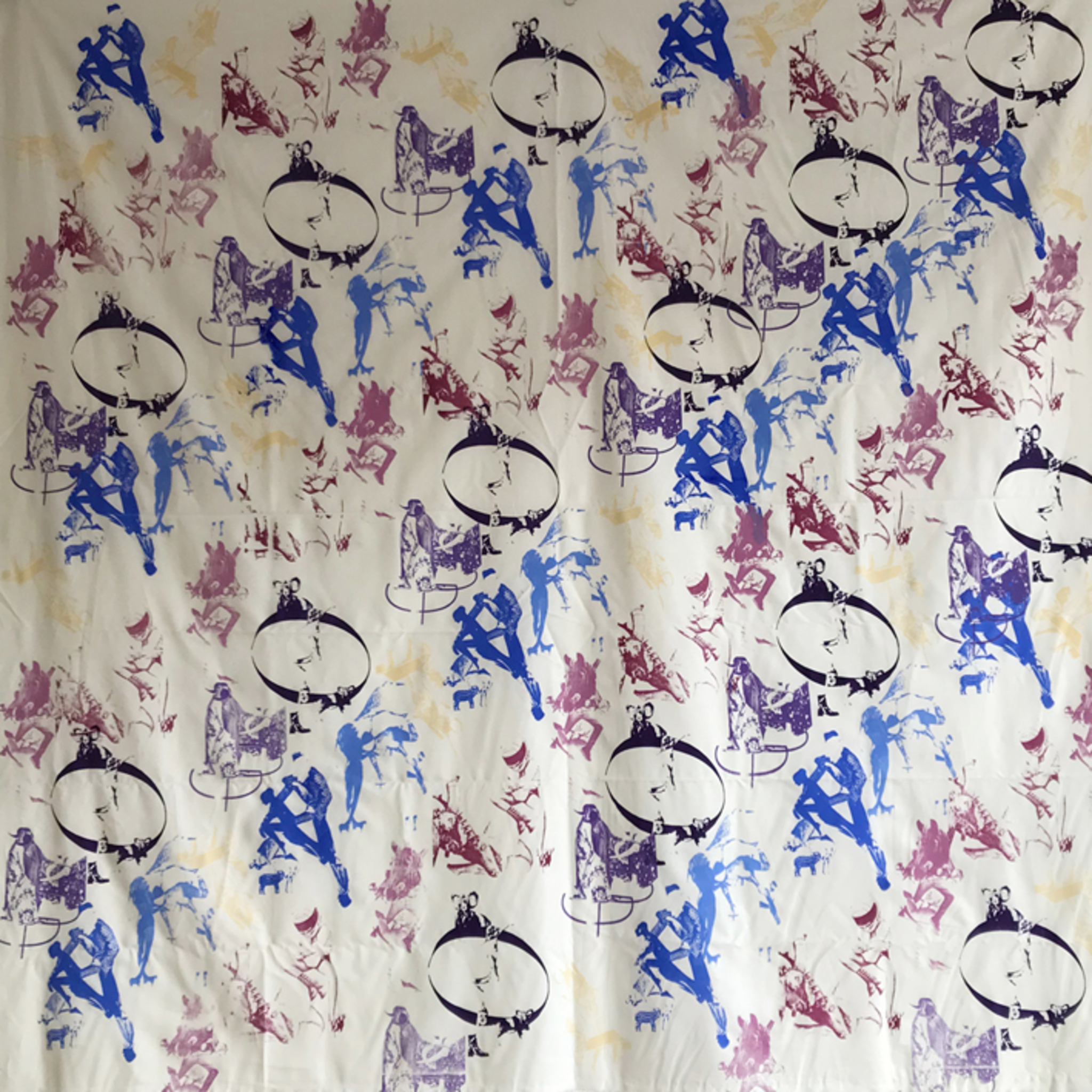 Collage op stof uit tijdschriften omgezet naar zwart/wit beeld verkleind naar A5 afgedrukt in ritme, kleur en herhaling