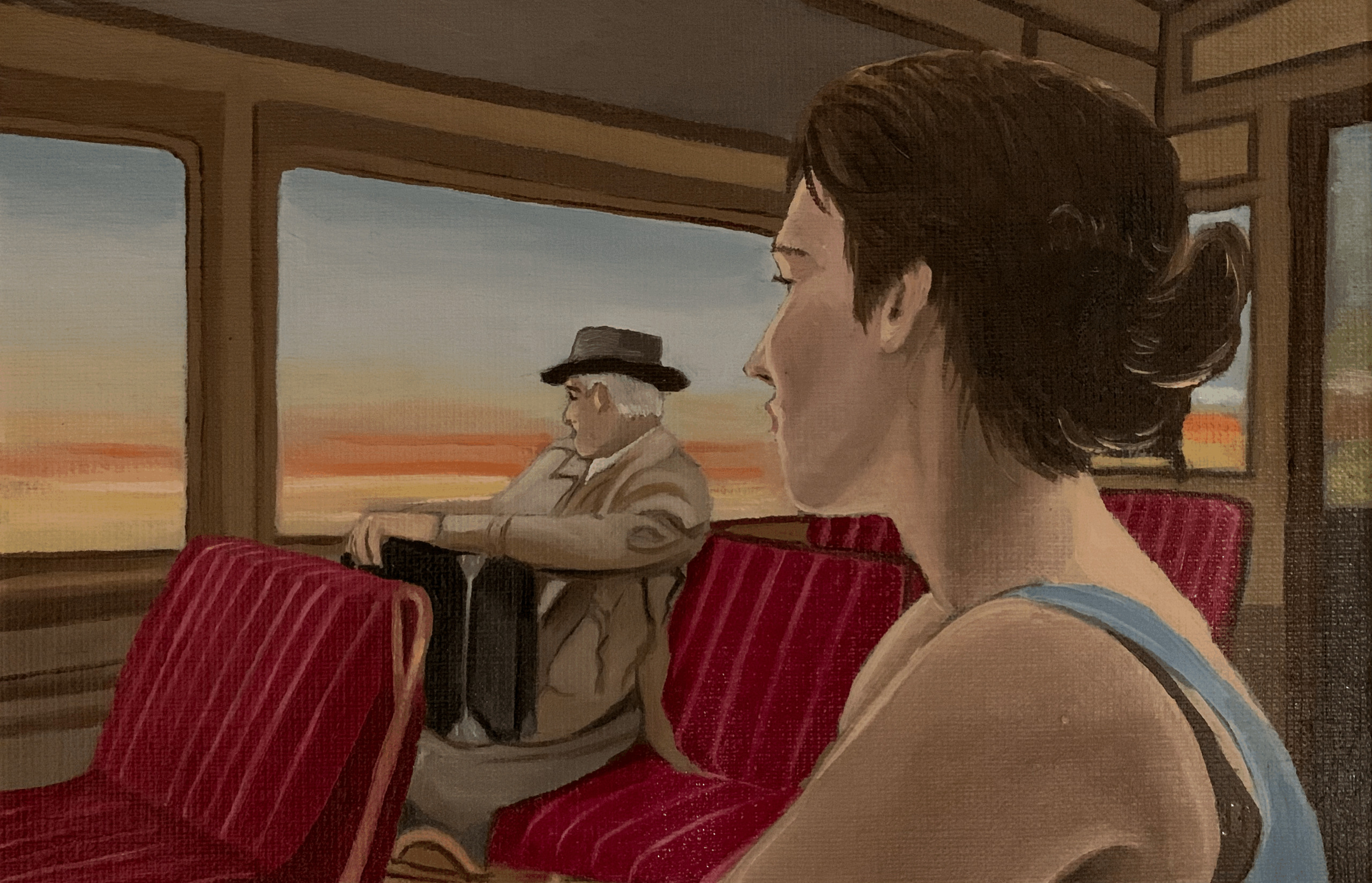 Een vrouw in zomerkledij en een handelsreiziger volledig ingepakt met koffers bij zich, het contrast kan niet scherper gesteld worden. Schijnbaar twee eenzame figuren die nog naar de ondergaande zon kijken. Elk met zijn eigen gedachten en mijmeringen in hetzelfde compartiment maar toch een beetje eenzaam.